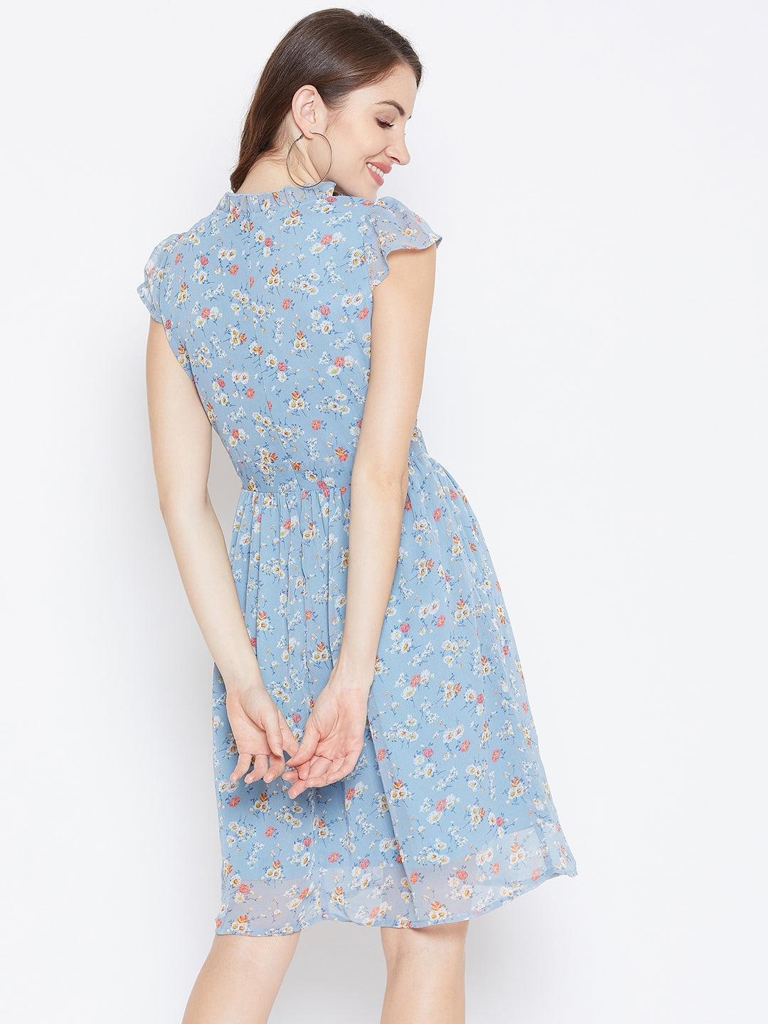 Build up your spring wardrobe by injecting vibrant hues of nature with this beautiful Blue Floral Printed Tie-Up Neck Pleated Fit & Flare Mini Dress from the floral print collection introduced by Berrylush. Compromising a tie-up neck design that gives a decorative sheen to your neckline and the short cap sleeves of the dress get your arms a charming look with proper ventilation attributes. The attached lining of the dress adds a flattering appeal to your casual look while the blue shade symbolizes your calming and creative personality and the floral print flaunts nature's beauty. Complete the look by pairing up this bedazzling fit and flare dress with a pair of strappy heels and a sling bag to get a radiant final look.
