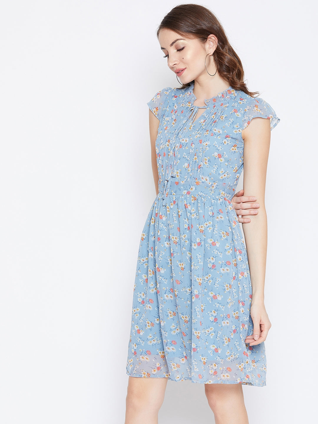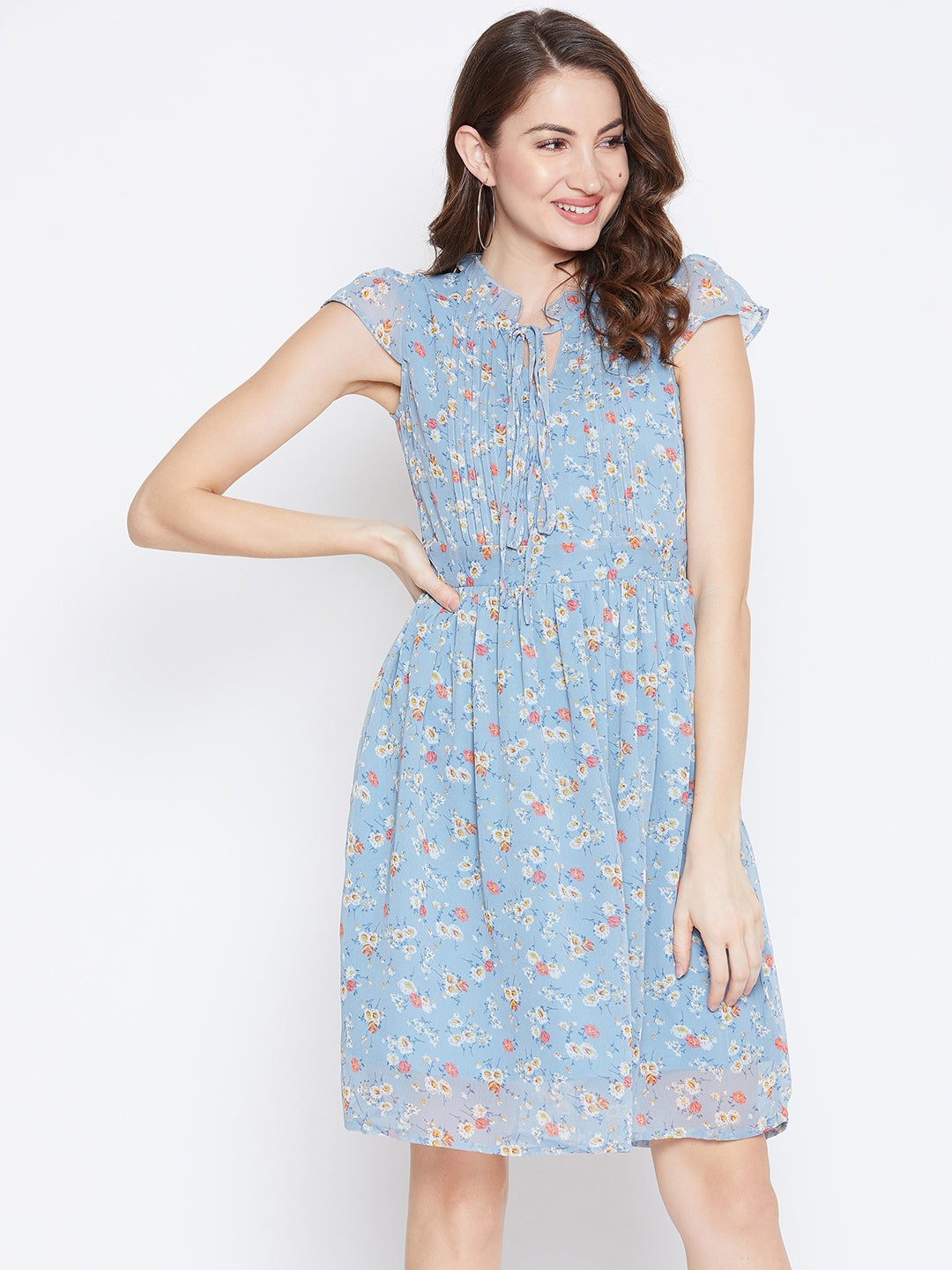 Berrylush Women Blue Floral Printed Tie-Up Neck Pleated Fit & Flare Mini Dress