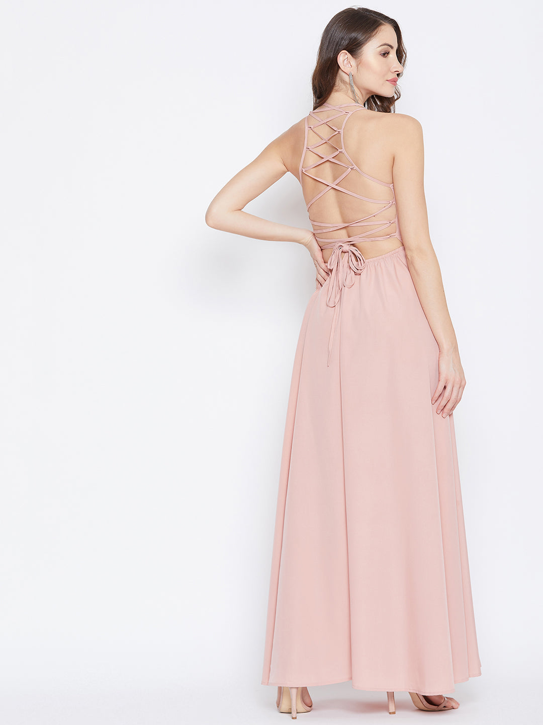 Berrylush Women Solid Light Pink Square Neck Caged Back Tie-up Maxi Dress
