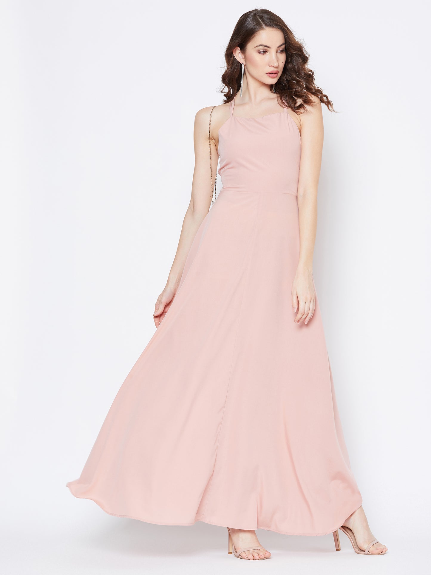 Magnify your casual wear collection for summer seasons with this pretty Solid Light Pink Square Neck Caged Back Tie-up Maxi Dress from Berrylush. This dress enables you to look trendy and comfortable as its crepe polyester fabric provides unrestricted breathability along with an amazing drape which further gives glamourous texture to your casual look. Designed with shoulder straps that elegantly highlight your beautiful neckline and shoulders while the light pink solid pattern of the dress adds feminine charm to your look. Maxi length in flared hem lends modish and flattering essence to the dress. To get a captivating look pair up this adorable maxi dress with a pair of block heels and a trendy purse.