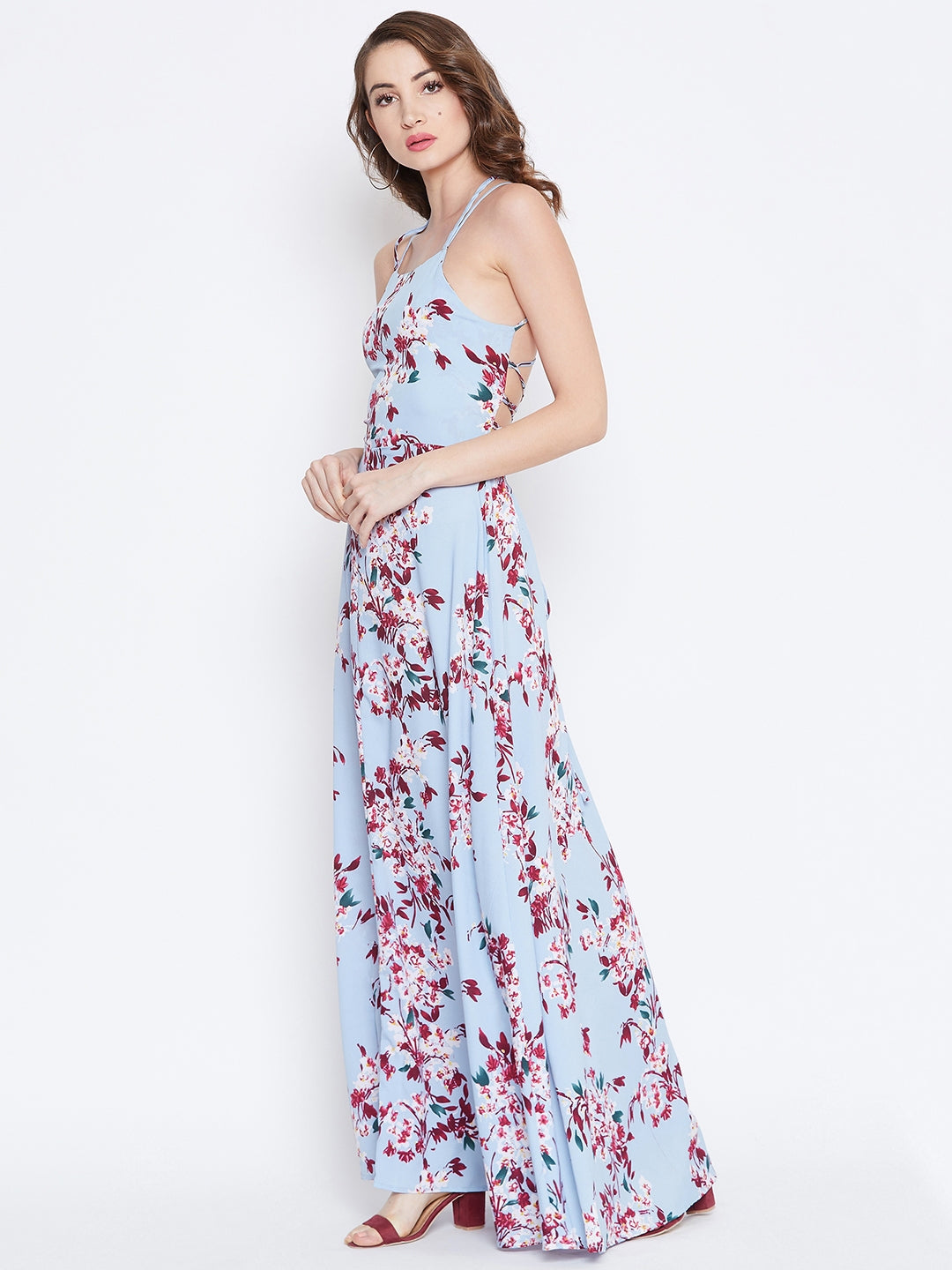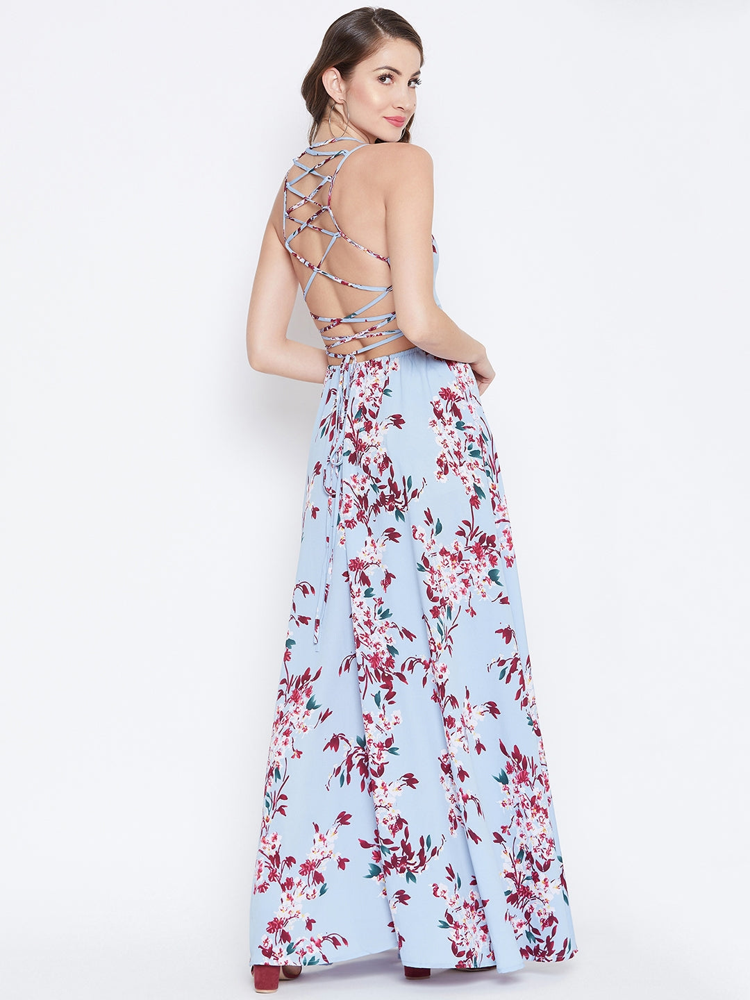Berrylush Women Blue & Maroon Floral Print Caged Back Tie-up Maxi Dress