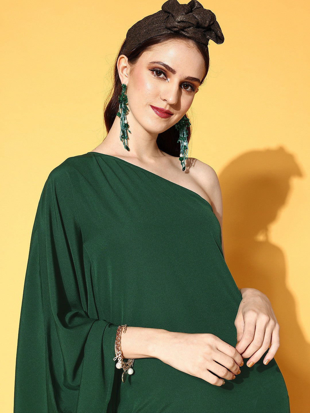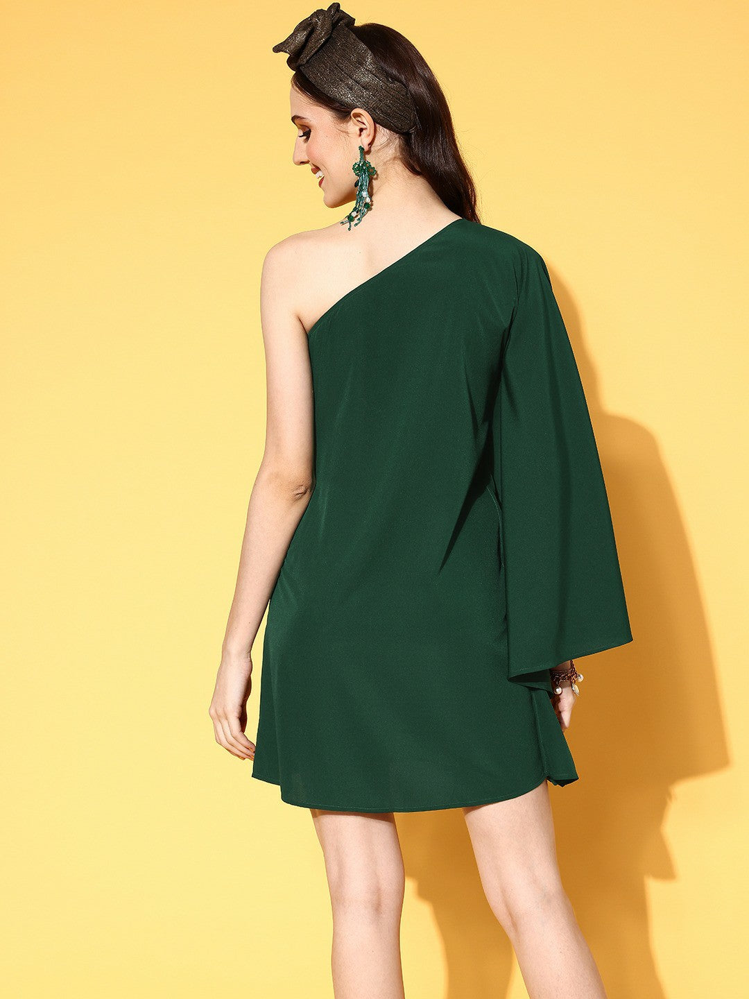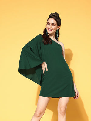 Berrylush Women Solid Green One-Shoulder Neck Batwing Sleeve Crepe Bodycon Mini Dress