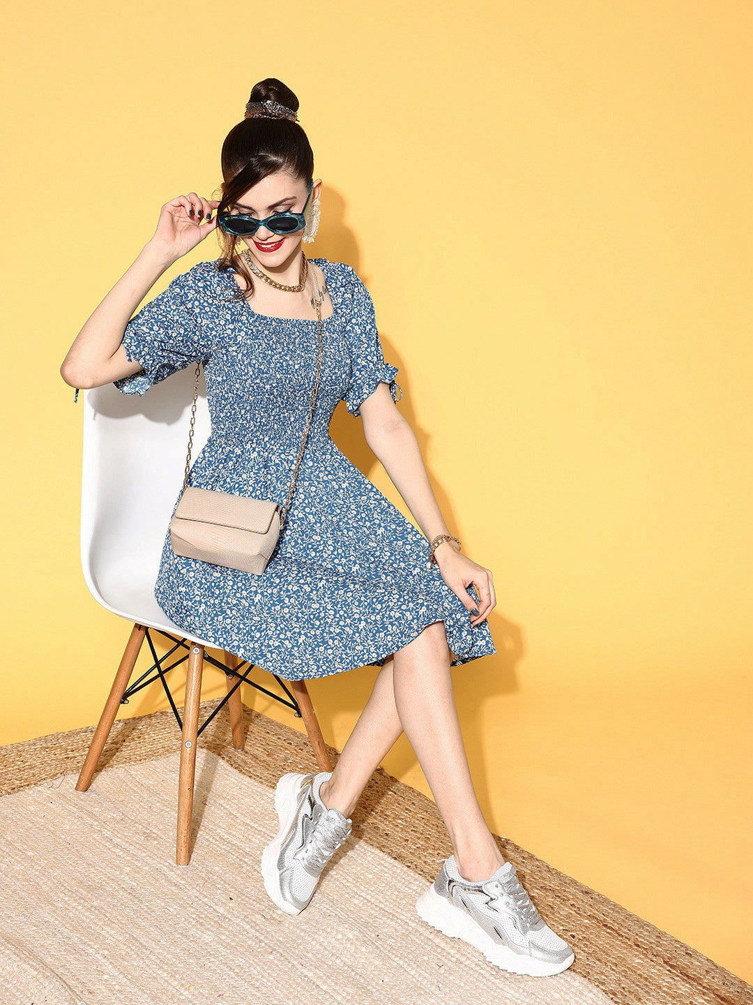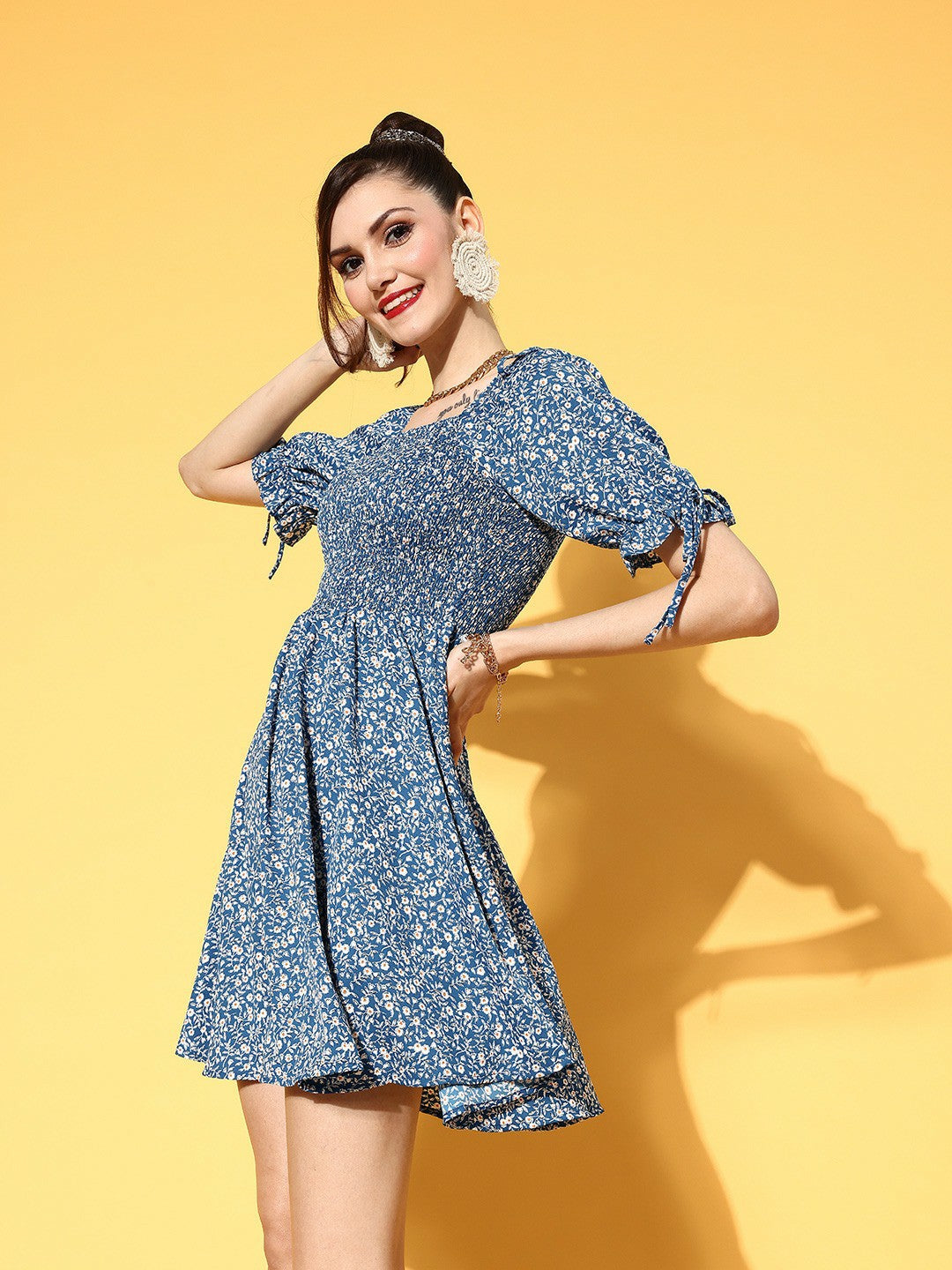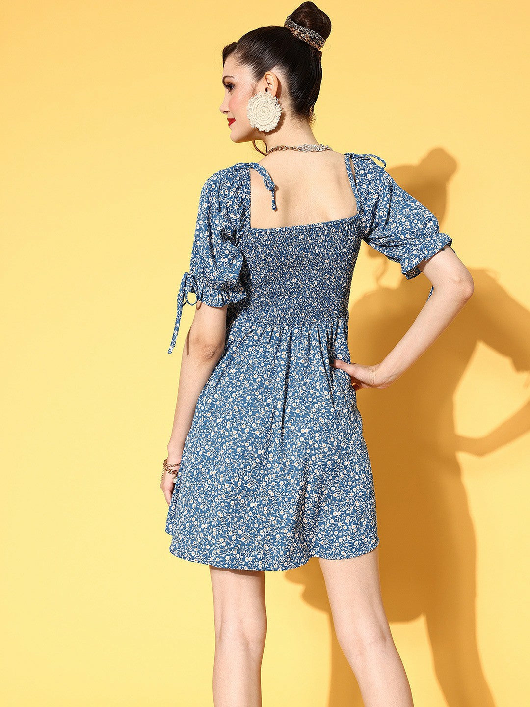 It's time to imbue a dash of boho-chic and refreshing essence to your outdoor wardrobe with this bedazzling Blue & White Floral Printed Square Neck Smocked Back Crepe A-Line Mini Dress from Berrylush. Adorned with short-puff sleeves that give a charming look to your arms. Punctuated from crepe polyester fabric that keeps this dress super light along with total airflow to keep you cool and comfortable for a prolonged duration. Comes with smocked surface styling that adjoins a decorative sheen to this dress while the mini length gives your legs an alluring appeal. Partner up this amusing mini dress with classy high-heels, hoop earrings, and a pretty side bag for a fashion-flattering look.