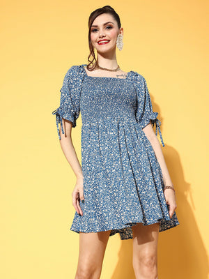 Berrylush Women Blue & White Floral Printed Square Neck Smocked Back Crepe A-Line Mini Dress