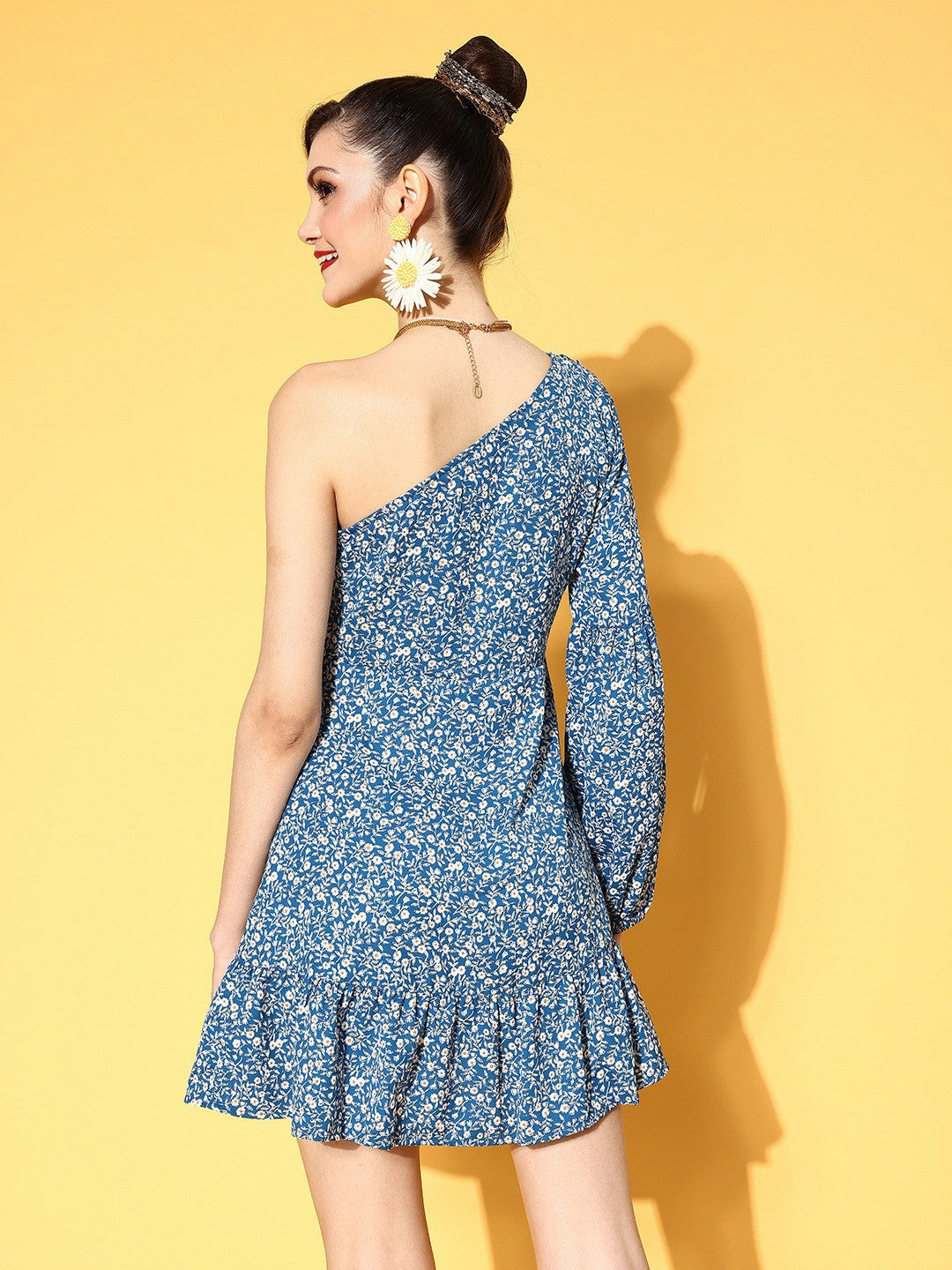 Berrylush Women Blue & Off-White Floral Printed One-Shoulder Neck Tulip Hem A-Line Mini Dress