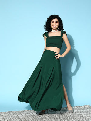 Berrylush Women Solid Green Square Neck Smocked Crop Top & Thigh-High Slit Maxi Skirt Co-Ord Dress