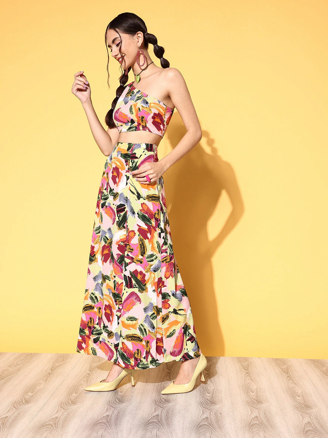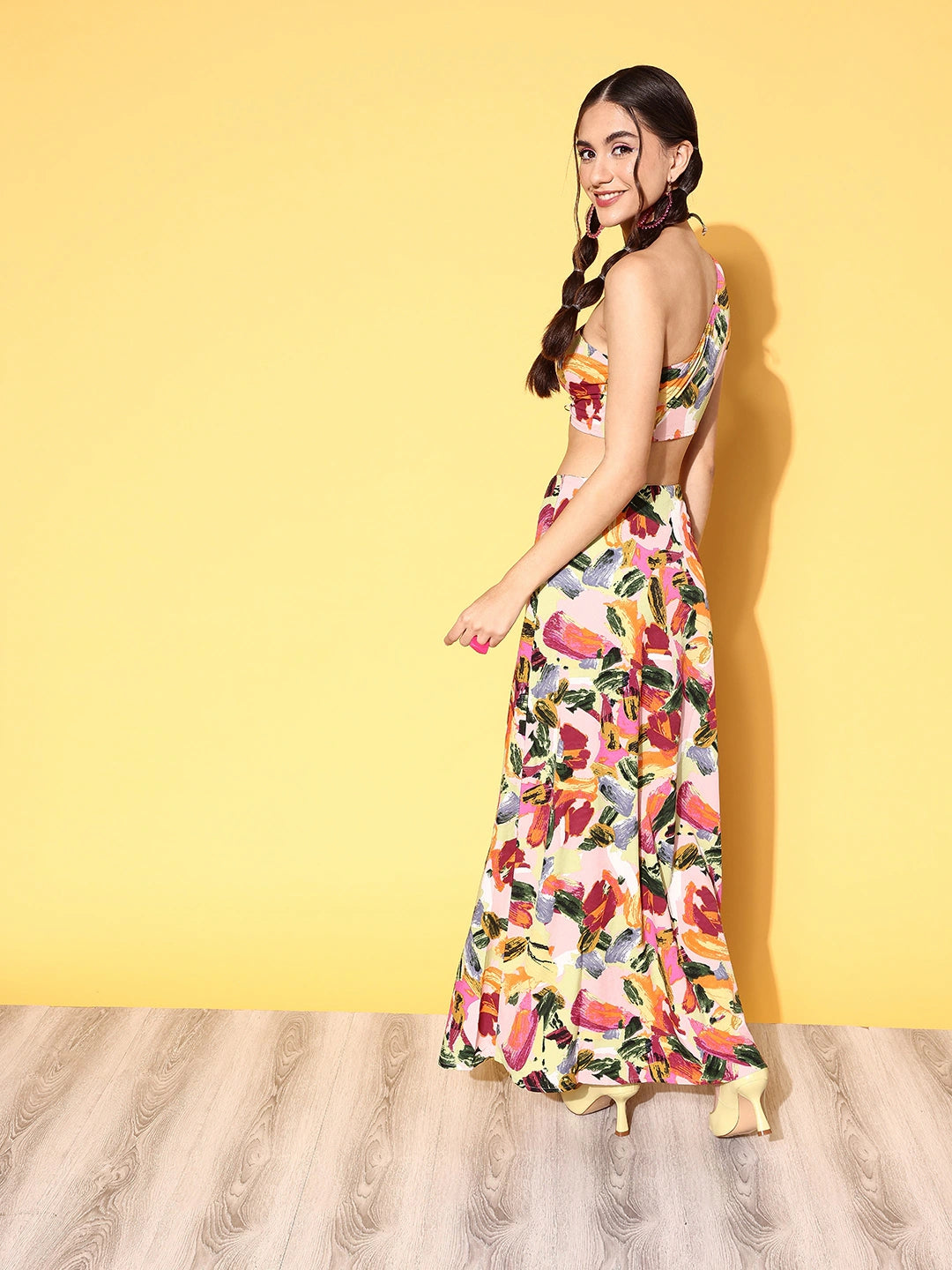 Berrylush Women Pink Abstract Printed One-Shoulder Neck Thigh-High Slit Maxi Co-Ordinate Set