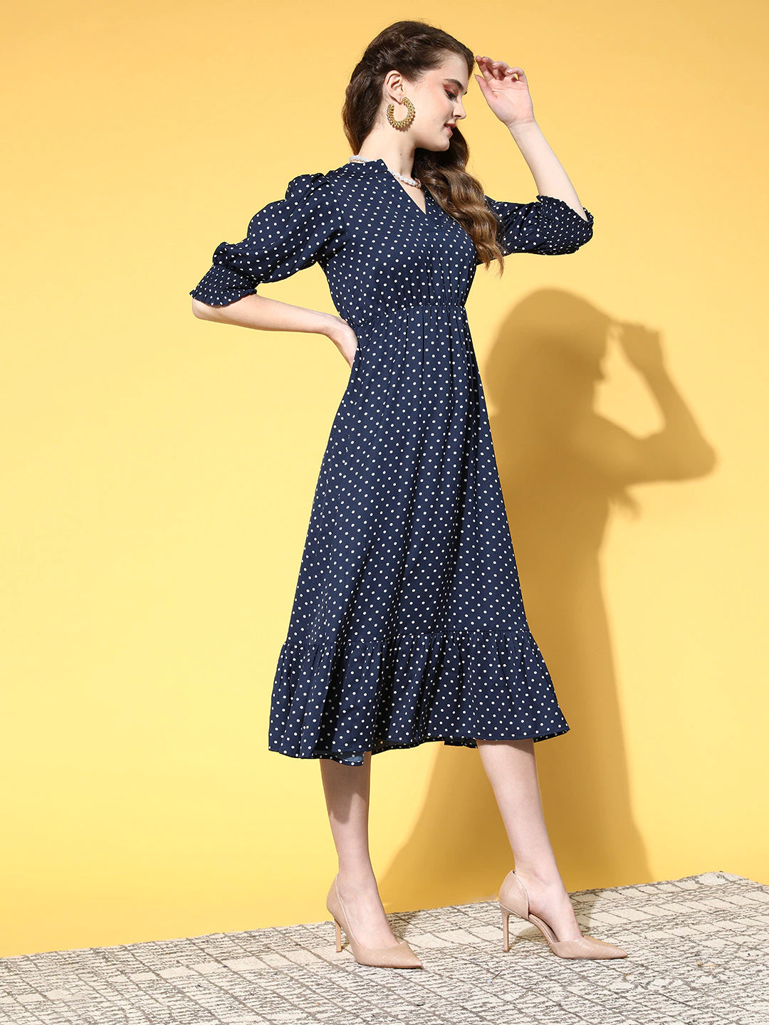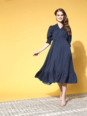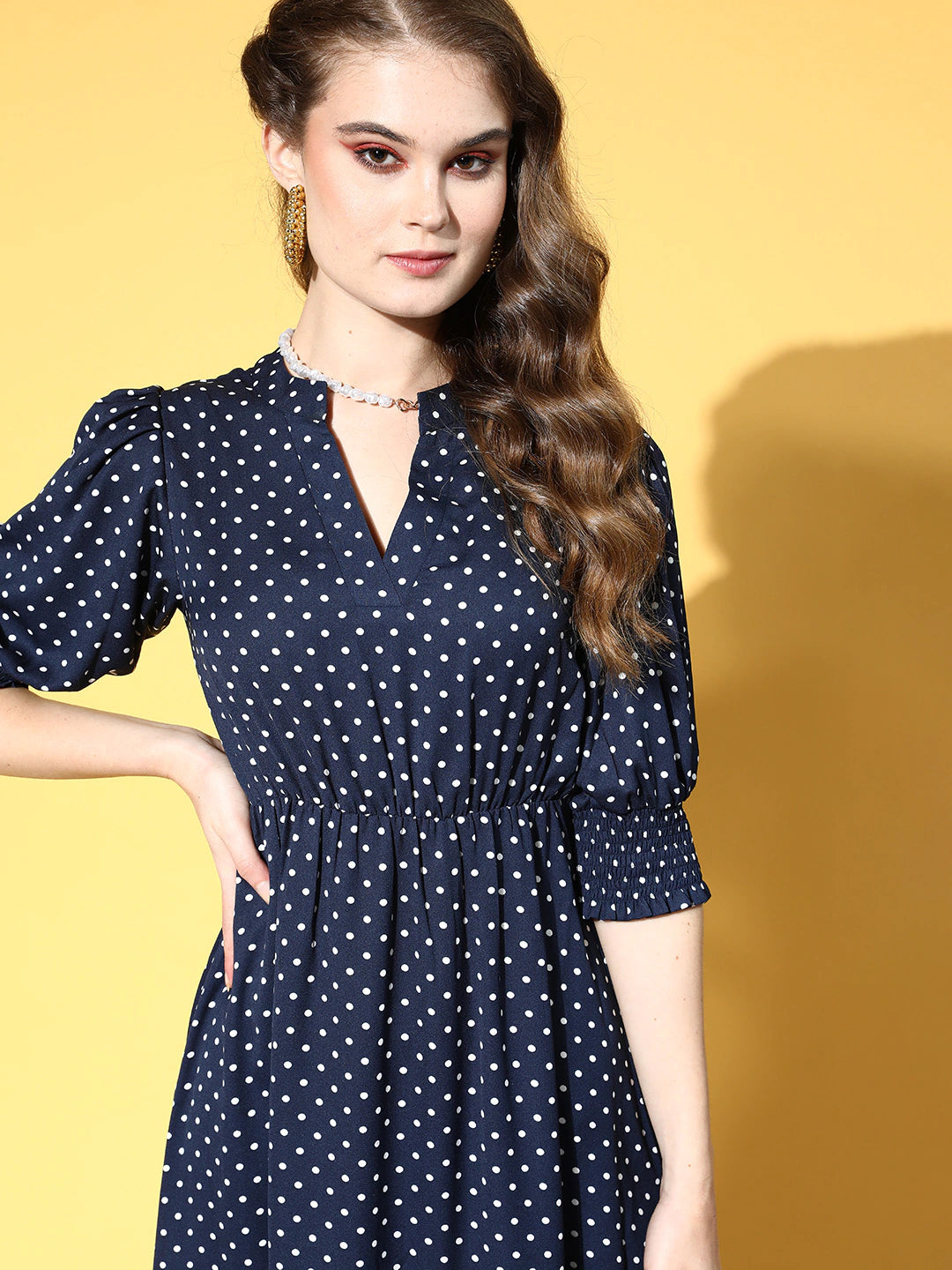Berrylush Women Navy Blue & White Polka Dot Printed Mandarin Collar Neck Crepe Pleated Fit & Flare Midi Dress