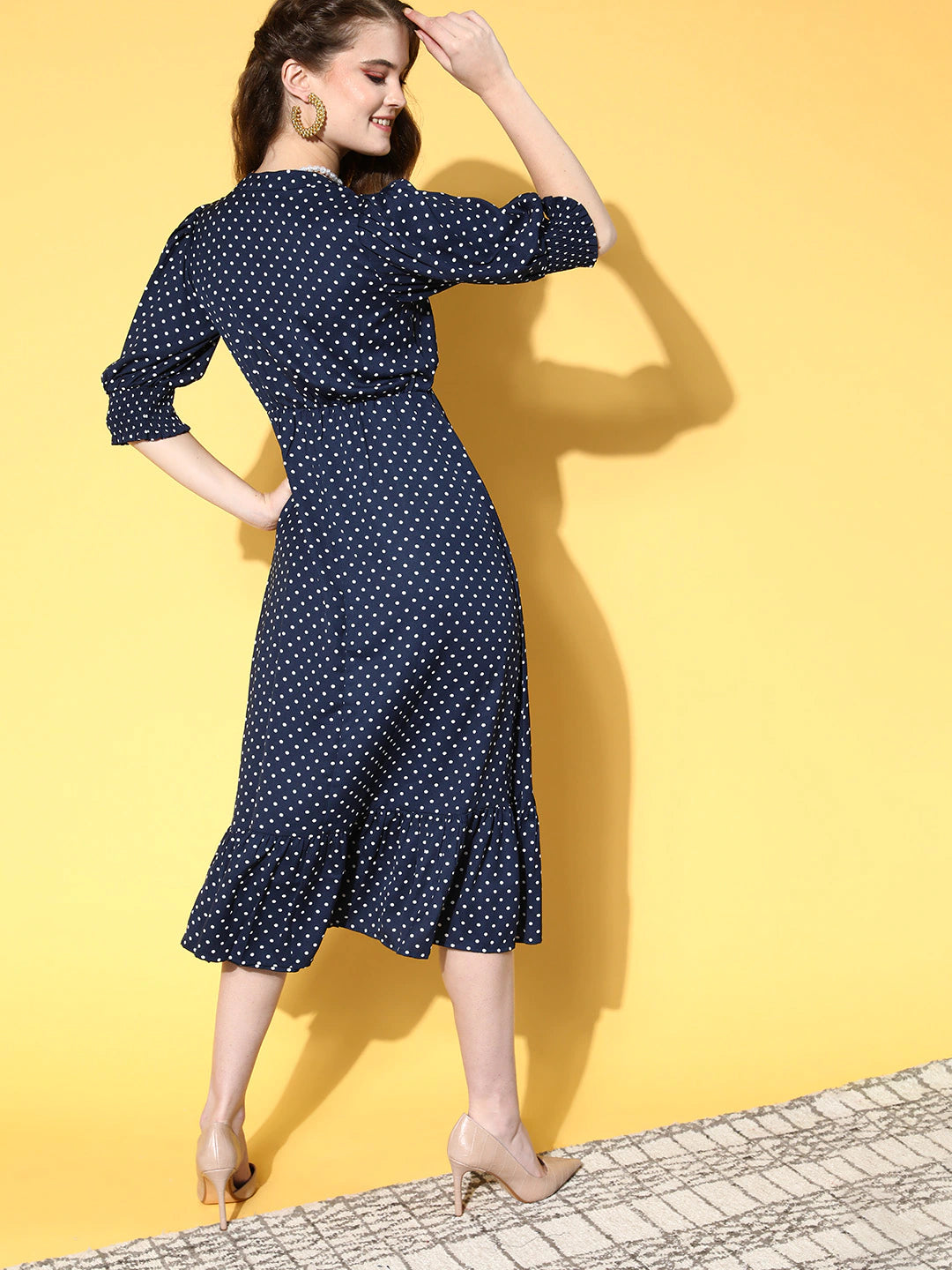 Play around with endless comfort and vintage style statement by donning this charming Navy Blue and White Polka Dot Print Crepe Fit and Flare Midi Dress designed by Berrylush. Styled with an amusing duo of navy blue and white polka dot print that lends this dress a striking appearance with a tinge of retro fashion note. Fashioned with a fit and flare shape that gives this dress cinched waist design accompanied by astonishing flair and drape to outshine your curves. Comes with woven detailing that enhances the durability and structural strength of this dress to gracefully withstand wear and tear issues. Complete your casual look stylishly by wearing this dress with a pair of blue block heels, tassel earrings, and a cute side bag.