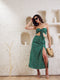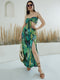 Berrylush Women Green & White Floral Printed Strapless Neck Front Tie-Up Crop Top & Thigh-High Slit Maxi Skirt Co-Ord Set