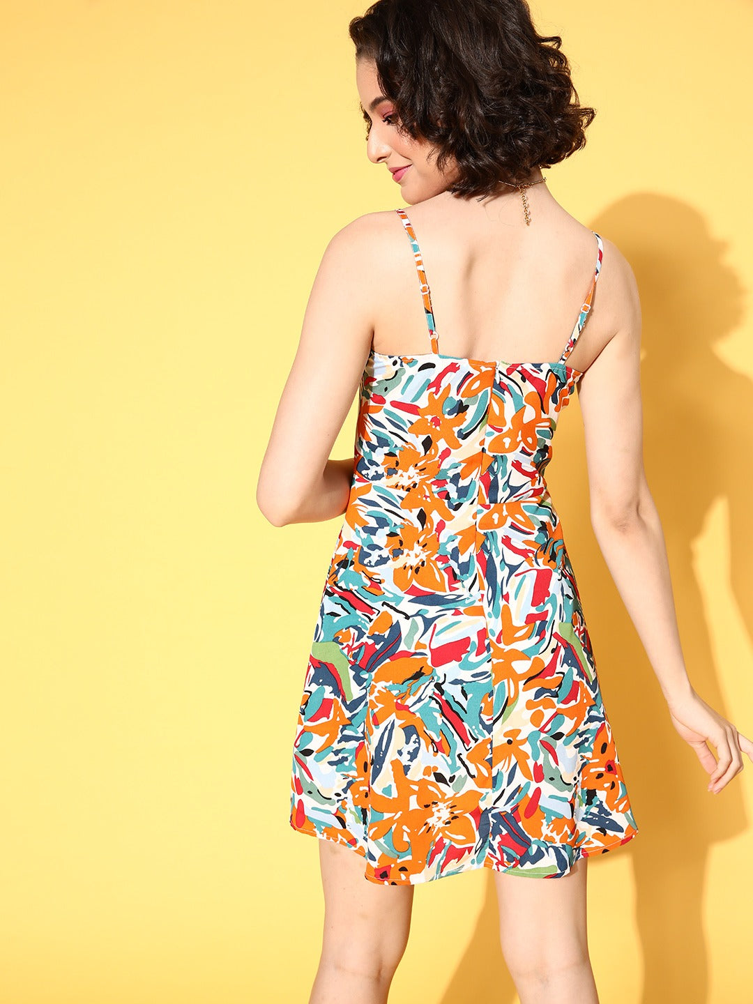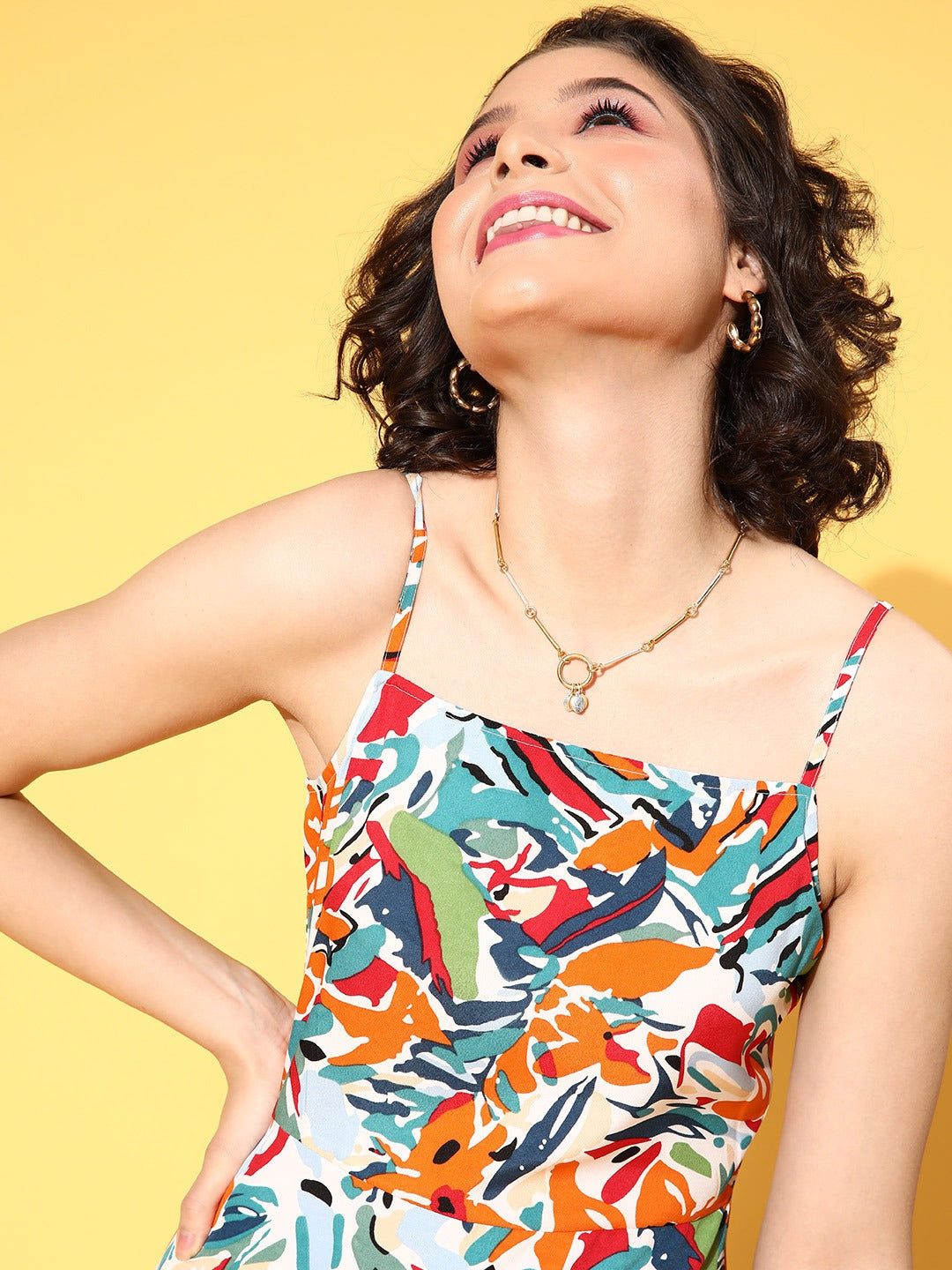 Refresh your wardrobe with the playfulness of colours by wearing this beautiful White & Multicoloured Abstract Printed Square Neck Crepe Flared A-Line Mini Dress from Berrylush. This dress enables you to flaunt your artistic side with its multicoloured abstract print that gives off a creative vibe and lends you a unique fashion statement. Featuring adjustable shoulder straps that provide a supportive silhouette to avoid stress over the back or front part of your body. Presenting above-knee length makes this dress an appropriate option to wear for most casual occasions without worrying about the weather condition. Wear this A-line dress with a pair of cute caged heels and a stylish handbag to get a fashion-focused look.