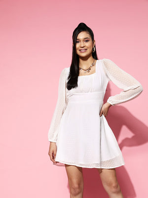 Berrylush Women Solid White Dobby Weave Square Neck Georgette Pleated Fit & Flare Mini Dress
