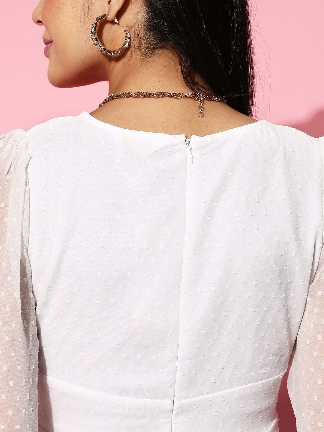 Intertwined with the true epitome of pure elegance and sophistication by opting for this sassy Solid White Dobby Weave Square Neck Georgette Pleated Fit & Flare Mini Dress introduced from the latest casual wear collection of Berrylush. Tailored with a fit & flare shape to give this dress sartorial perfection with a curve-hugging fit that showcases your feminine figure. The long-puff sleeves present a perfect blend of retro and modern style with voluminous coverage to your arms. Comes with concealed zip closure that makes this dress easy to pull on and take off without taking much time. Finish your look effortlessly by pairing this dress with your favourite heels, matching earrings, and a cute side bag.