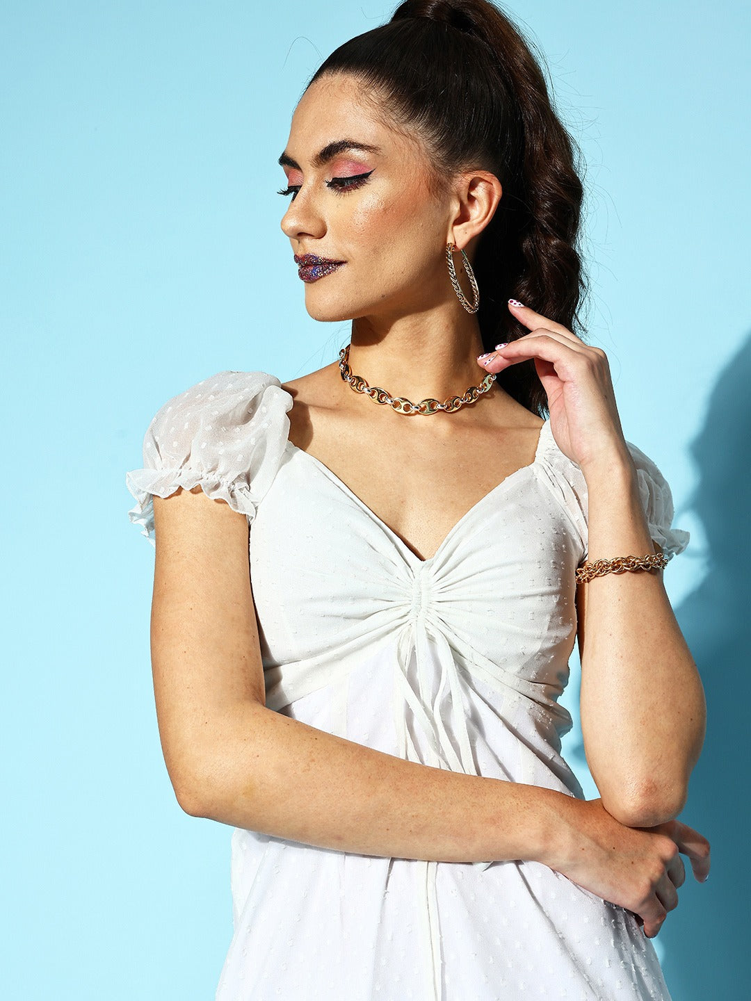 Berrylush Women Solid White Dobby Weave Sweetheart Neck Georgette Flounce Hem Ruffled A-Line Mini Dress