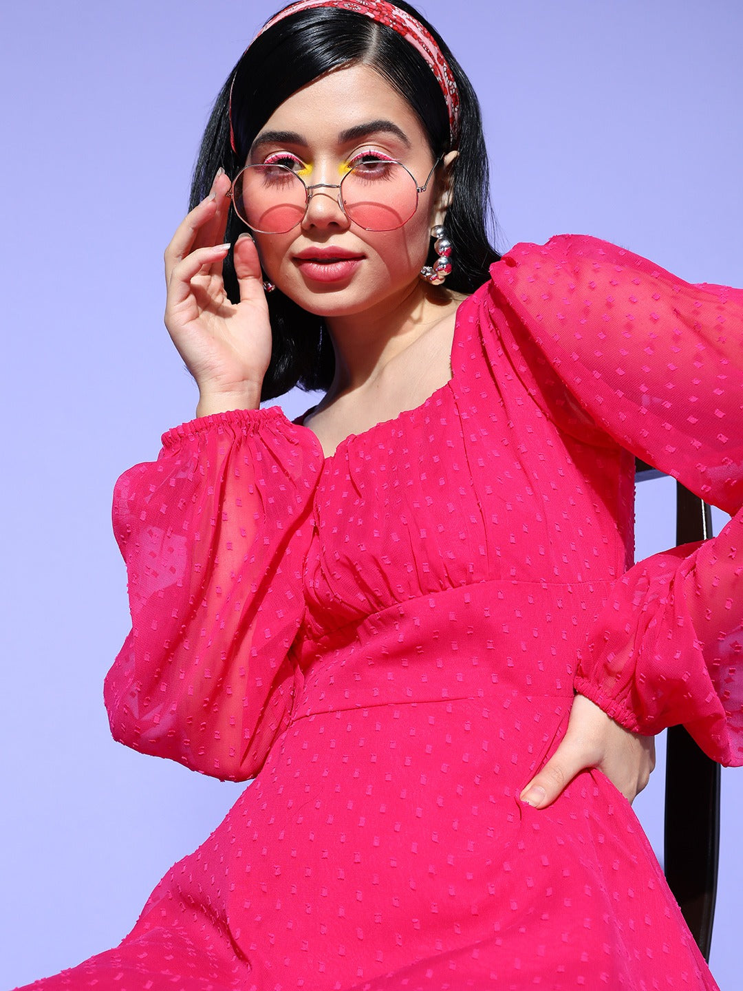 Berrylush Women Solid Pink Dobby Weave Square Neck Georgette Pleated Fit & Flare Mini Dress