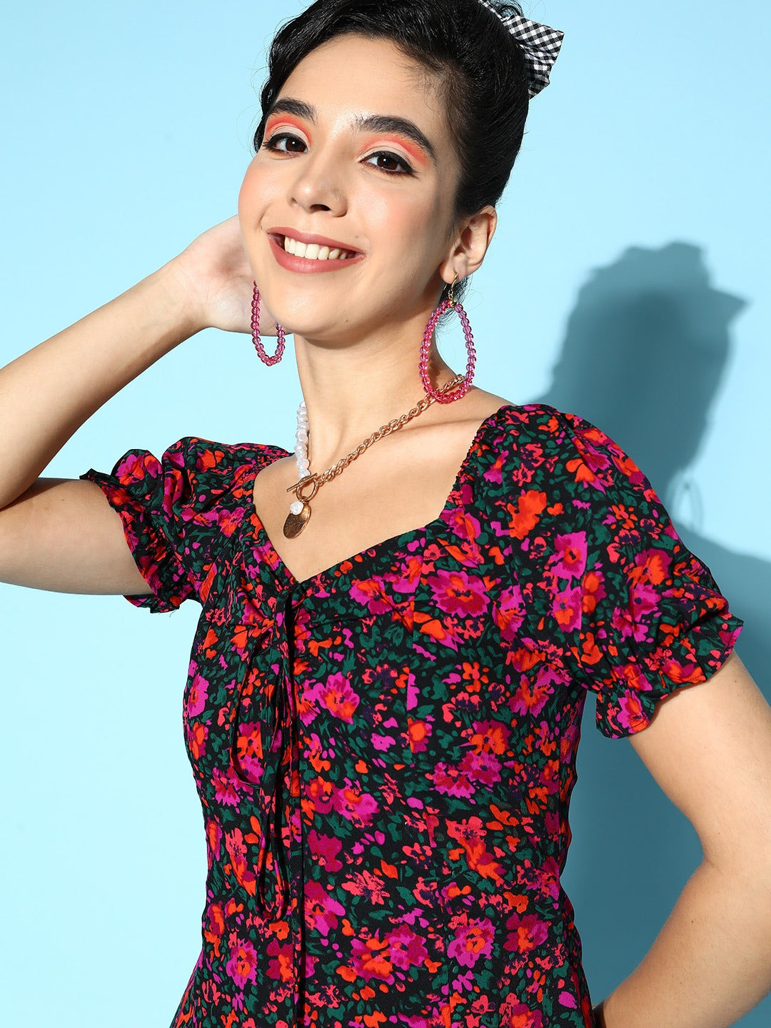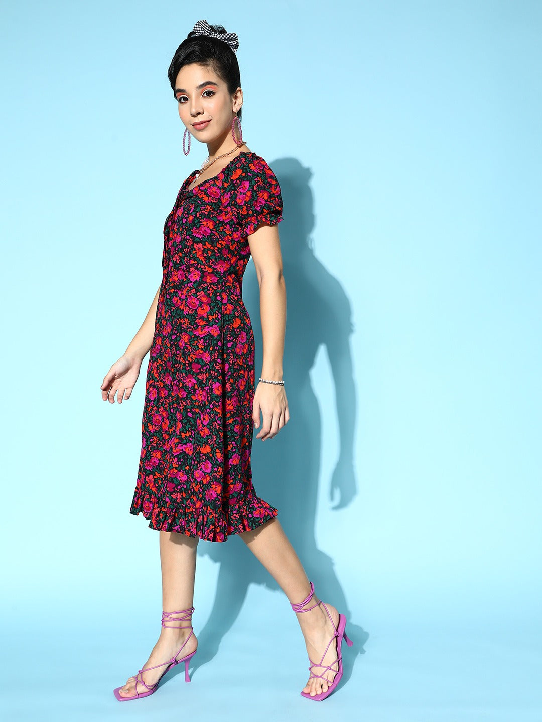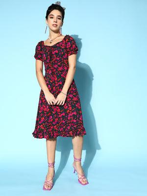 Berrylush Women Black & Pink Floral Printed Sweetheart Neck Front Tie-Up Ruffled A-Line Midi Dress