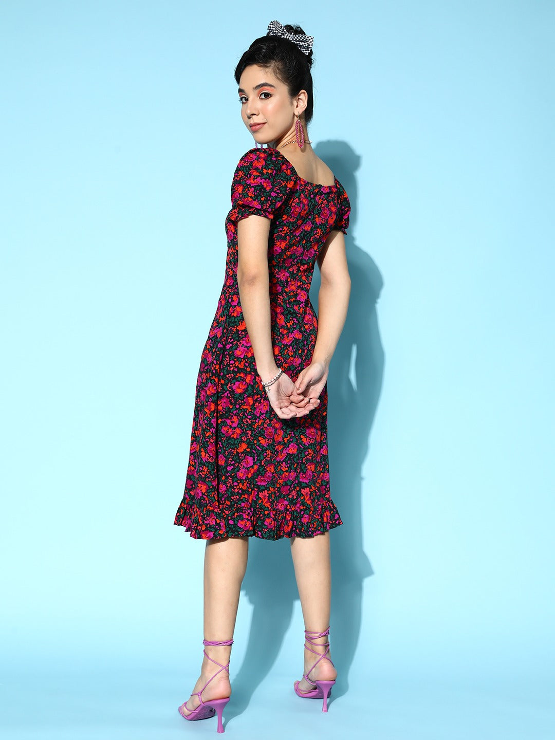 Cast an air of chicness and elegance to your casual assortment with the addition of this captivating Black and Pink Floral Print Crepe A-Line Midi Dress introduced by Berrylush. Flaunting flounce hemline that lends this dress a cinched waist design with flared hemline adjoins with pretty frills. Showcasing short-puff sleeves that give your arms appropriate and eye-catching coverage with a hint of periodical style. The woven detailing offers soft and irritation-free touch to your skin with anti-abrasion and anti-wrinkles properties to this dress. Team up this dress with a pair of matching heels, floral tassel earrings, and a sling bag for a bewitching look to attend any kind of casual event.