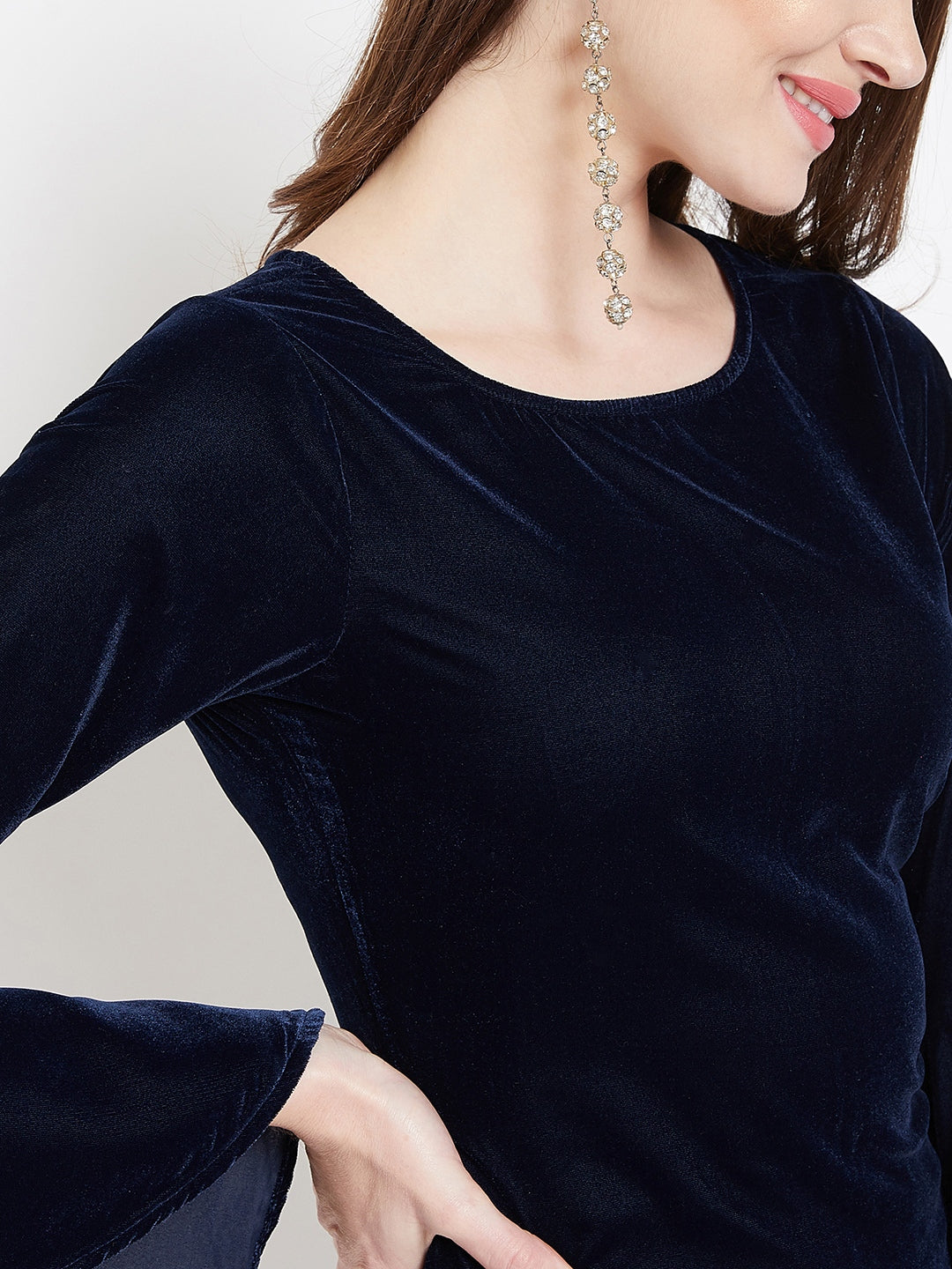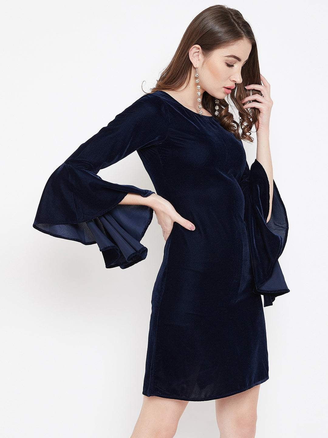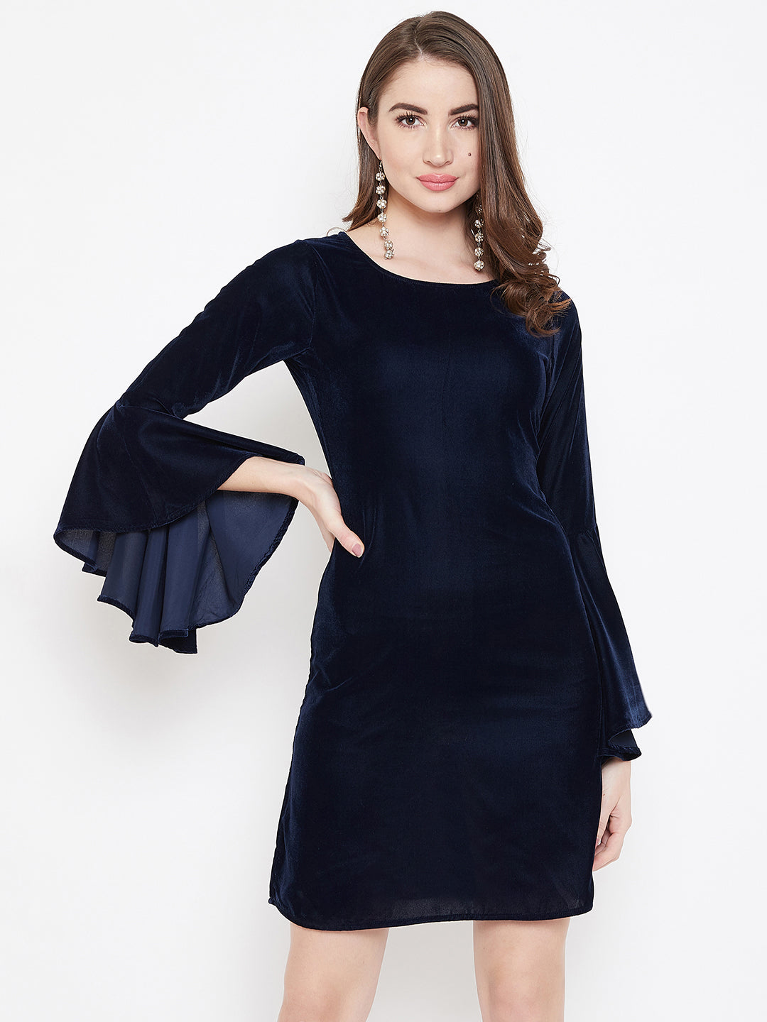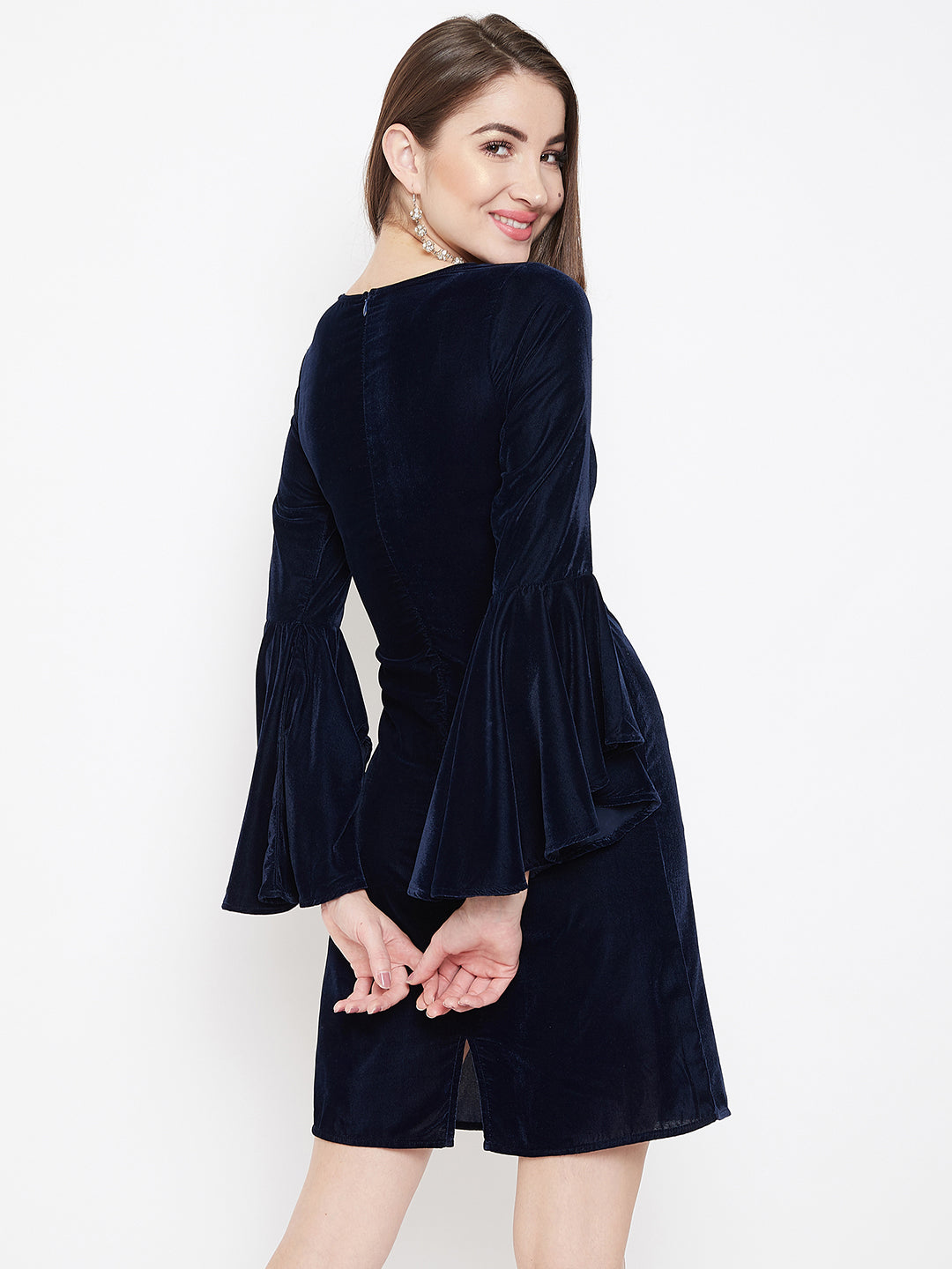 Berrylush Women Solid Navy Blue Round Neck Flared Sleeve Velvet Mini Dress