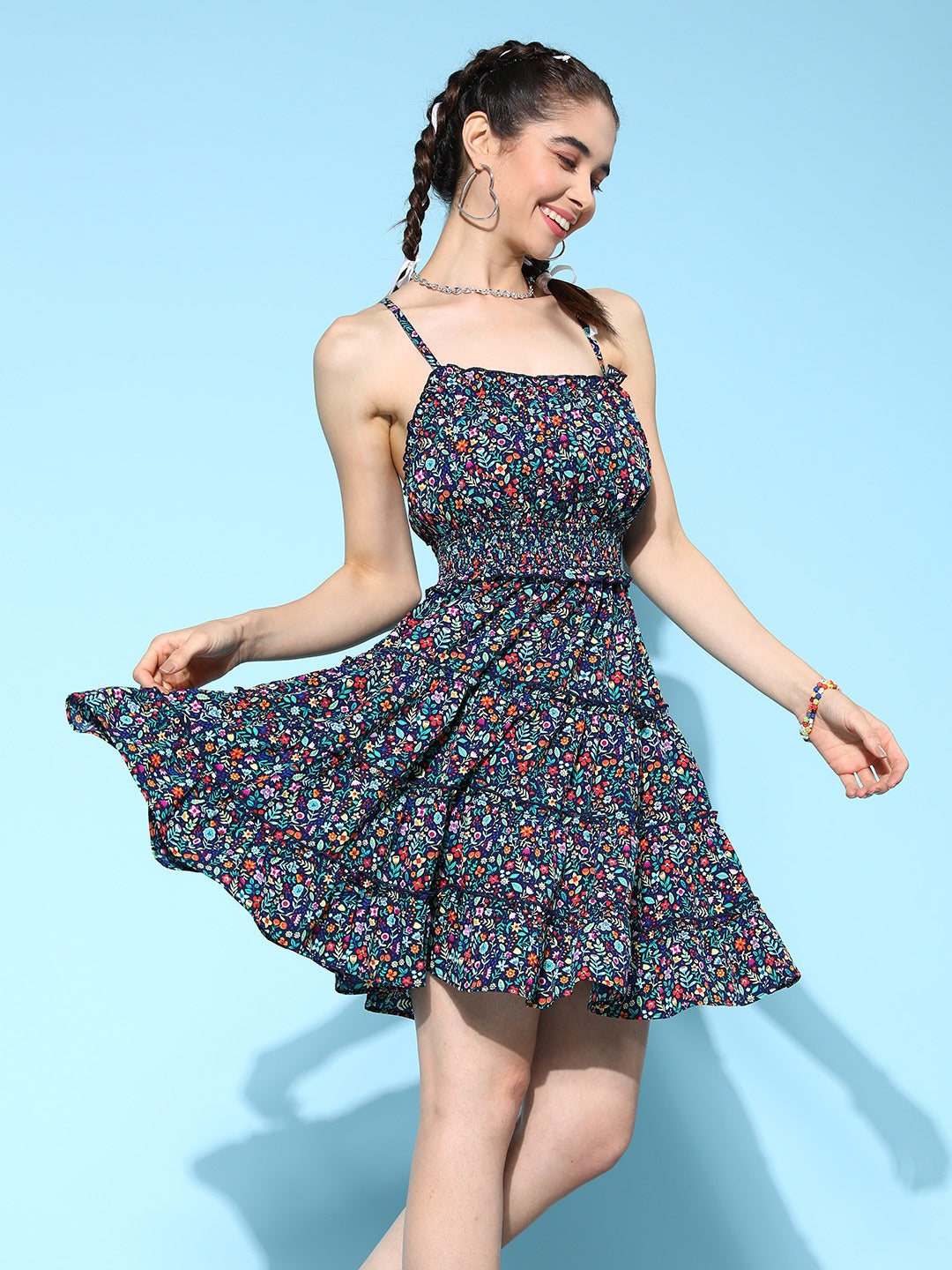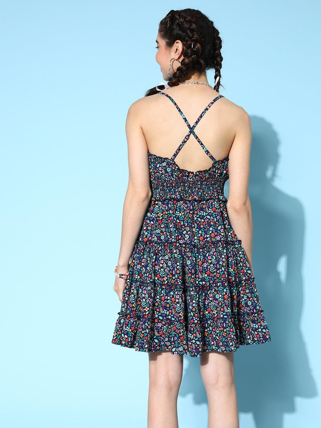 Berrylush Women Navy Blue & Orange Ditsy Floral Printed Square Neck Sleeveless Crepe Layered Fit & Flare Mini Dress