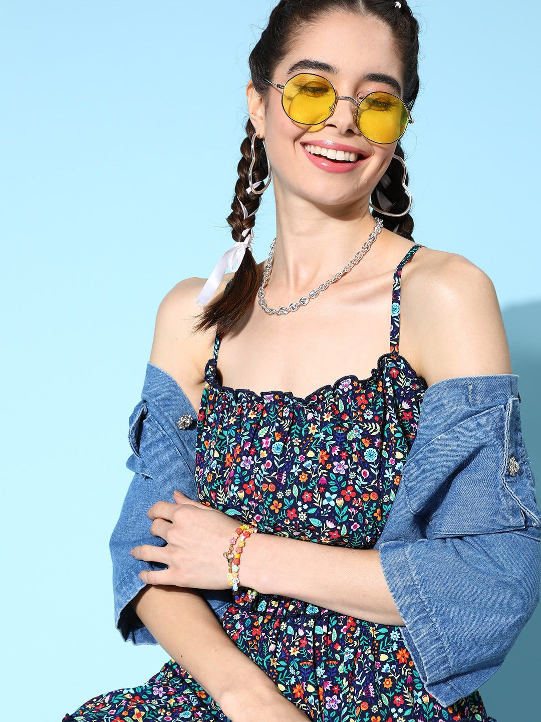 Grab all the attention towards your unique and dramatic fashion preference with this charming Navy Blue and Orange Floral Ditsy Print Sleeveless Crepe Mini Dress designed by Berrylush. Adorned with layered surface styling that gives this dress a breathtaking tiered design with extra volume. The sleeveless design lends this dress a dash of versatility while keeping your arms cool and comfy for a prolonged duration. Also, the criss-cross back design offers your back area an exotic and enticing appeal. Wear this mini dress with a pair of high-heels, floral hoop earrings, and a tote bag to get a stunning look for weekend outing plans.