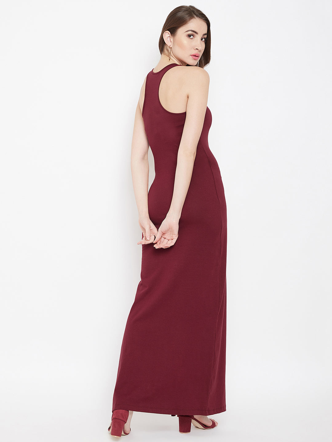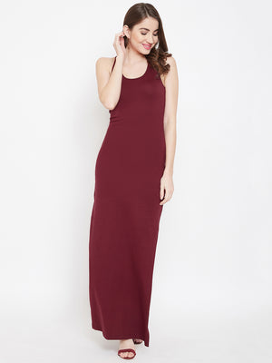 Berrylush Women Solid Maroon Round Neck Racerback Thigh-High Slit Bodycon Maxi Dress