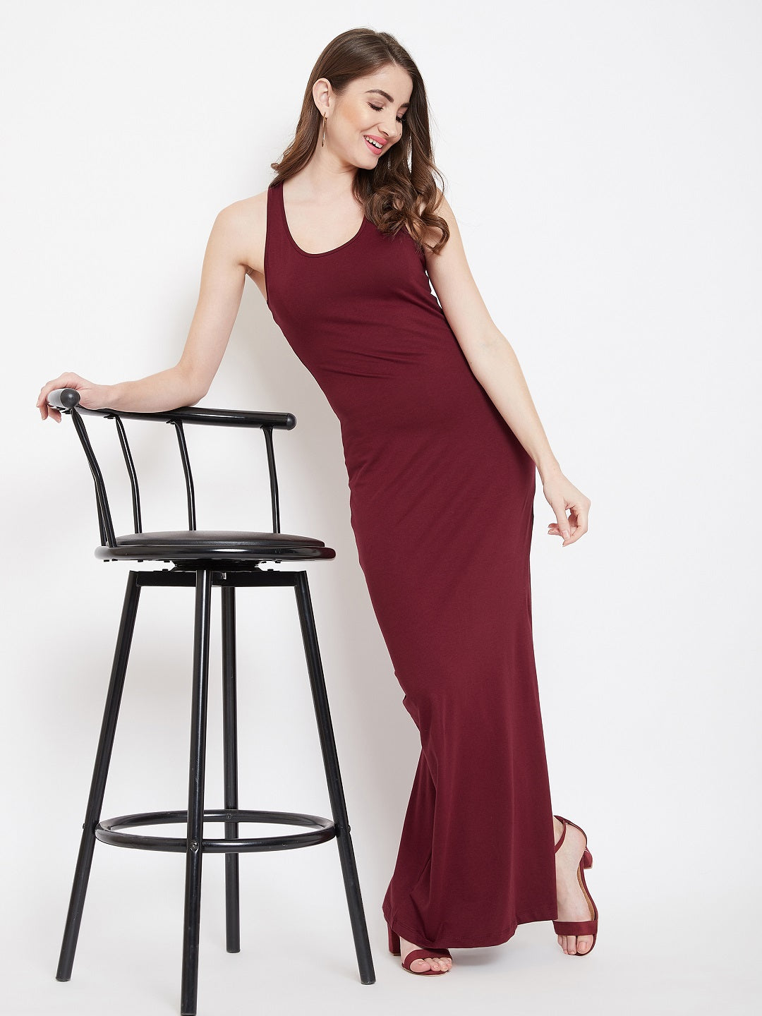 Turn up the heat this season by wearing this stylish Solid Maroon Round Neck Racerback Thigh-High Slit Bodycon Maxi Dress from Berrylush. The straight hemline with a side-slit attribute helps you to maintain a trendy outlook on casual outing events. Designed with bodycon fitting and sleeveless characteristics to represent a body-hugging fit with the monochromatic vibe. The round neck with a maroon solid pattern gives an elegant and vintage outlook while the knitted jersey fabric creates a gleaming fashion statement. Complete your party outlook by teaming up this captivating dress with a sling bag and a pair of high heels.