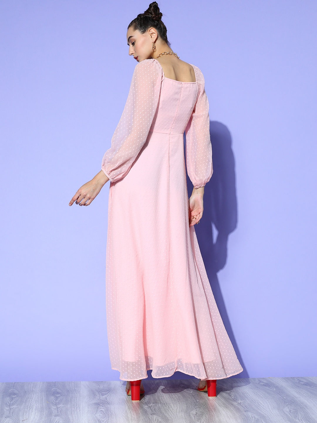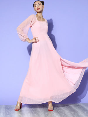 Berrylush Women Solid Pink Dobby Weave Square Neck Thigh-High Slit Flared A-Line Maxi Dress