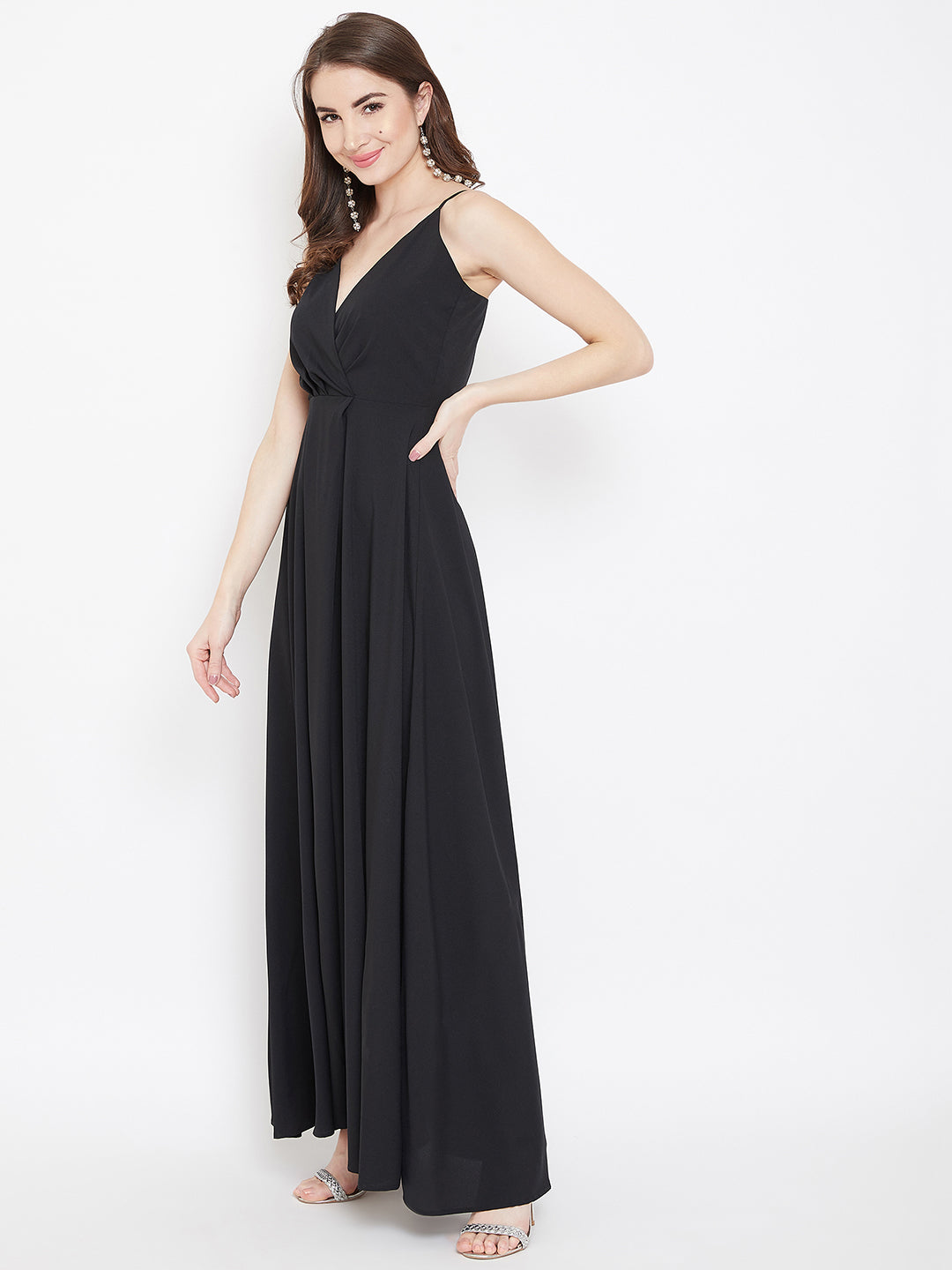 Berrylush Women Solid Black V-Neck Sleeveless Crepe Thigh-High Slit A-Line Maxi Dress