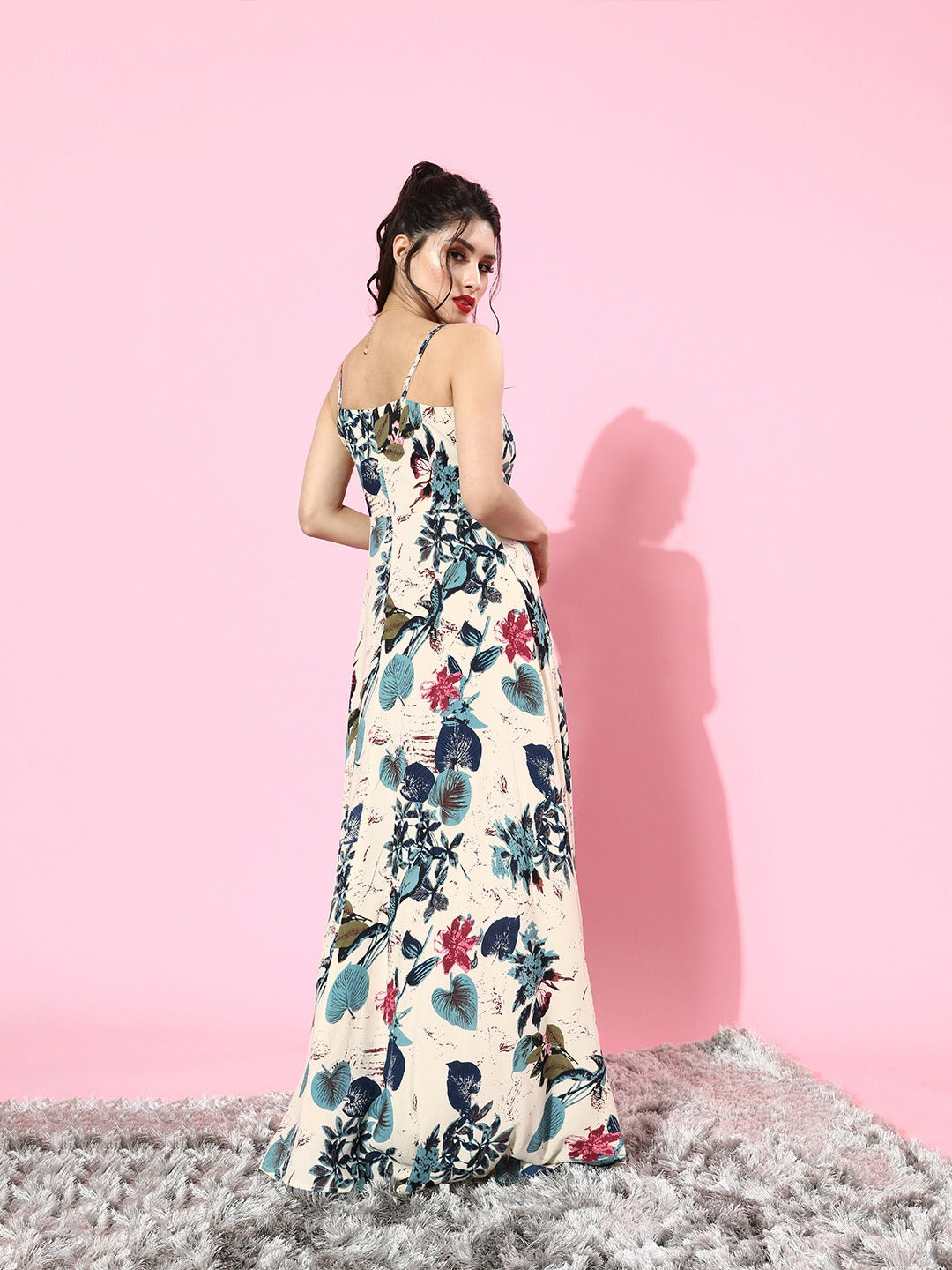 Berrylush Women White & Blue Tropical Printed V-Neck Maxi Dress
