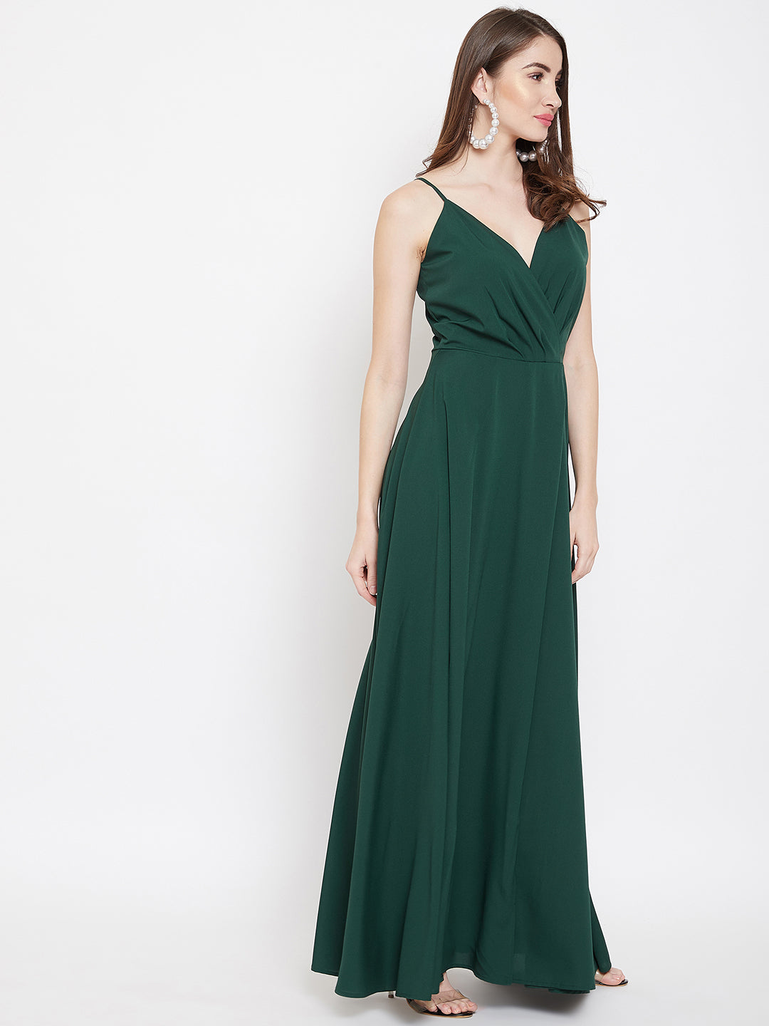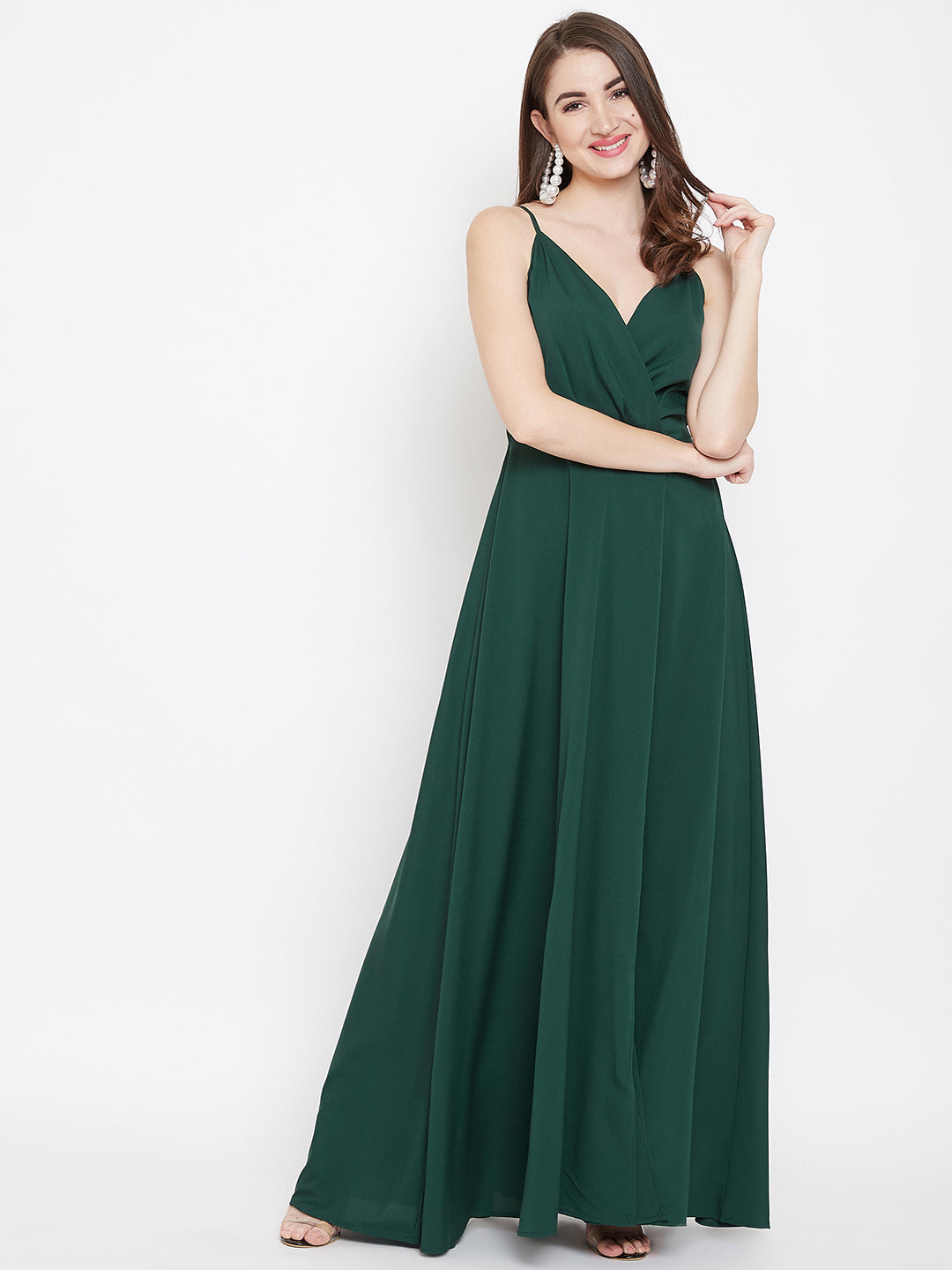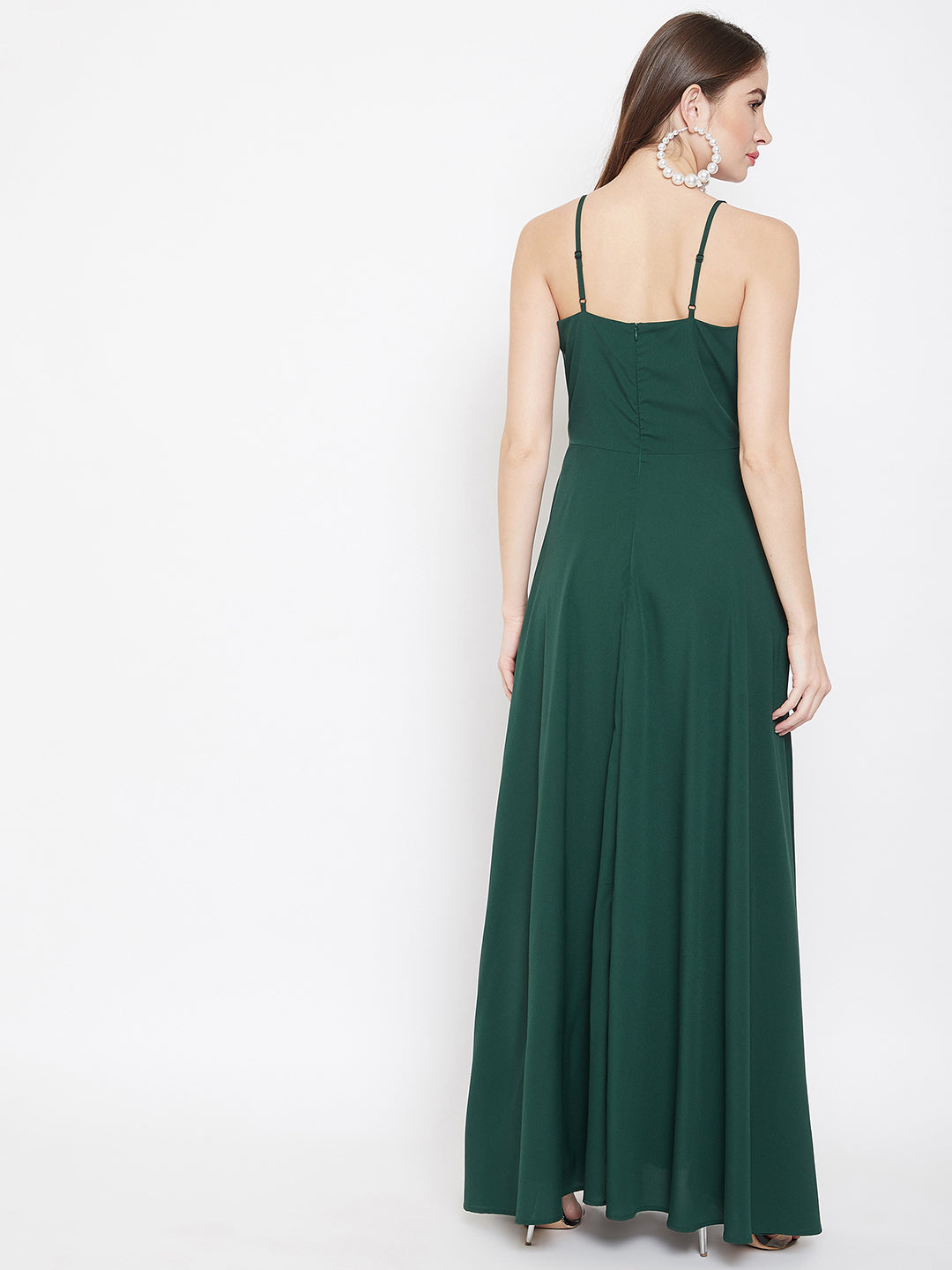 Get your wardrobe a classic and trendy makeover with this bewitching Solid Green V-Neck Sleeveless Crepe Thigh-High Slit A-Line Maxi Dress from Berrylush. The green shade with a solid pattern culminates a vintage and royal vibe and the V-neckline calls attention to your beautiful neckline. The front thigh high slit design with a flared hemline steals the spotlight by making the look appear captivating. The shoulder straps and zip closure provide easy wearing and non-slip feature while the woven detailing offer a curve-defining attribute. Complete your look by matching up this glamorous maxi dress with high-heels and clutch to look fascinating.