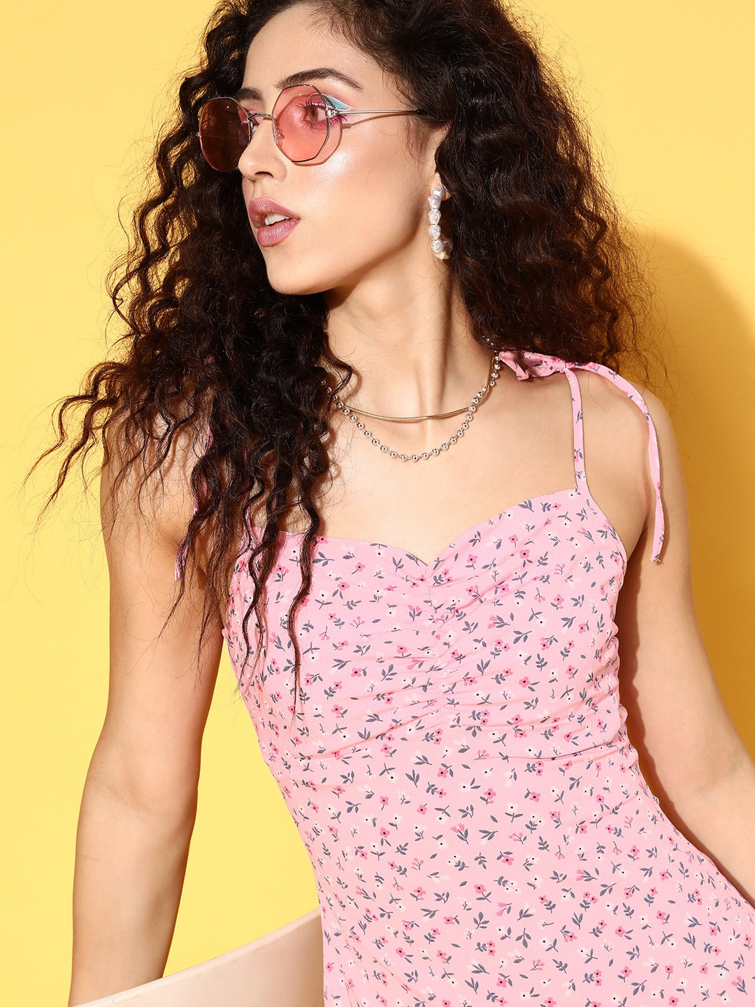 Ace the weekend by uplifting your style to a whole new level with this pretty Pink and White Floral Print Sleeveless Bodycon Knee Length Dress from Berrylush. Displaying bodycon shape that gives this dress a body-hugging silhouette to highlight your curves without any discomfort. Designed with concealed zip closure to simplify the fastening process with a secure set-up and refined finish. Spun from high-quality crepe polyester fabric to offer this dress an astonishing resistance from abrasion and shrinking over time. Look fabulous on your next date by pairing this dress with white sneakers, floral jewellery, and a straw side bag.