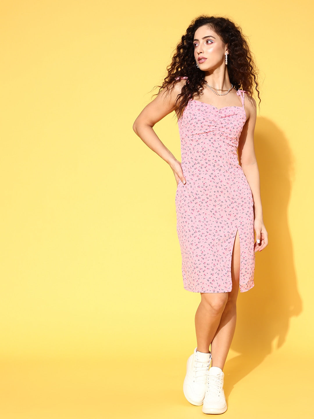 Berrylush Women Pink & White Floral Printed Square Neck Tie-Up Strap Thigh-High Slit Straight Hem Sheath Midi Dress