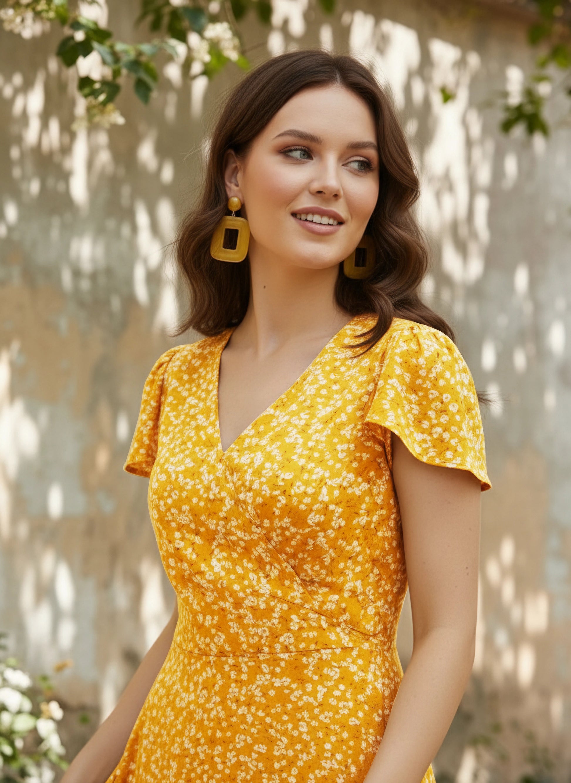 Rejoice yourself this summer season with this Yellow Floral Printed A-Line Wrap Mini Dress from the summer collection of Berrylush. Crafted out from polyester fabric with a regular fit feature makes the dress comfortable with the moisture-wicking property and body-defining aspect. Warm and cosy essences are also depicted from the ditsy floral print while the cap sleeves attribute enables you to attract attention at any casual meets. The wrap detailing and flared hemline make this maxi dress look chic and cute. Pair this amazing dress with a side bag and matching high heels to develop a stunning look.
