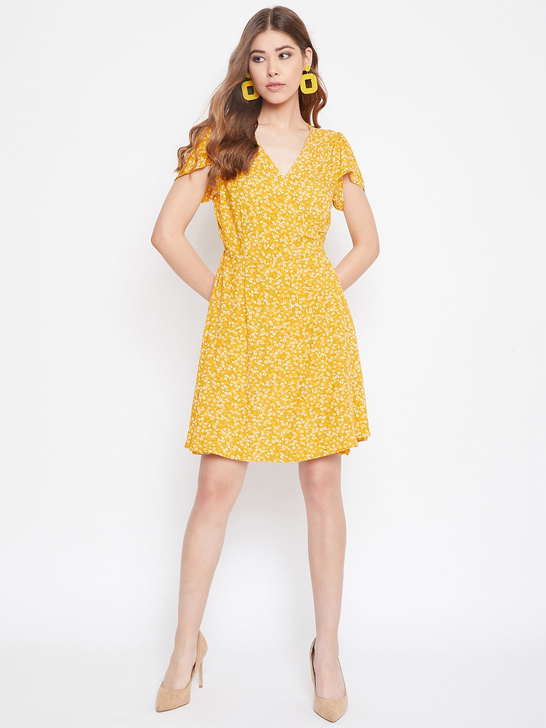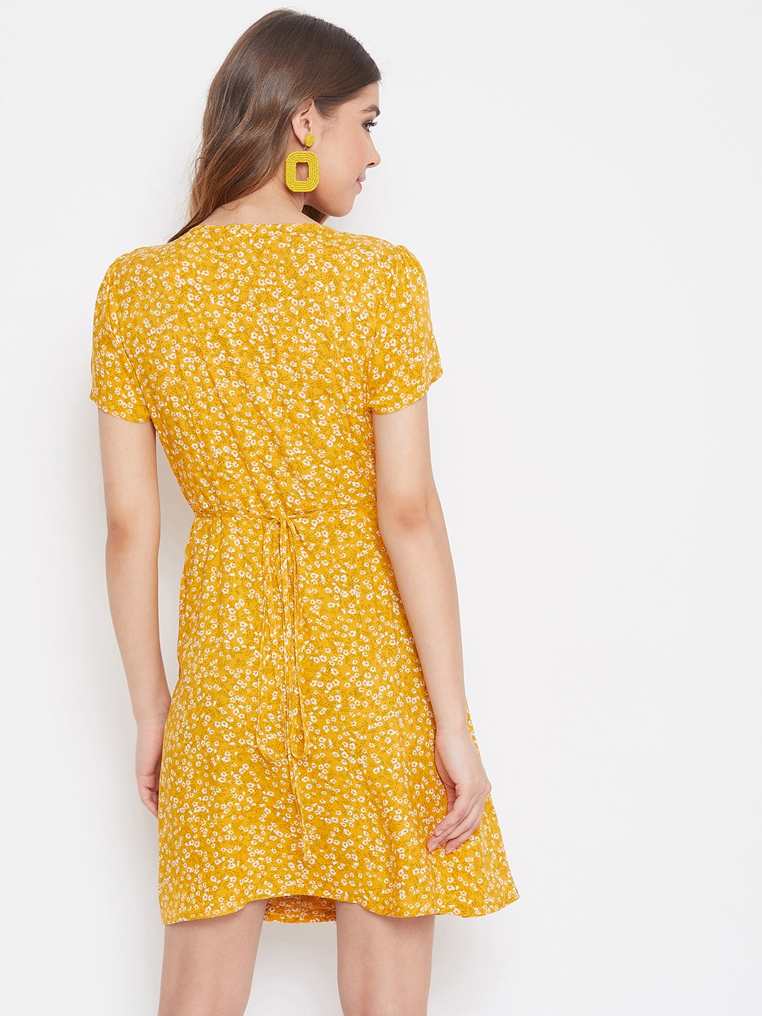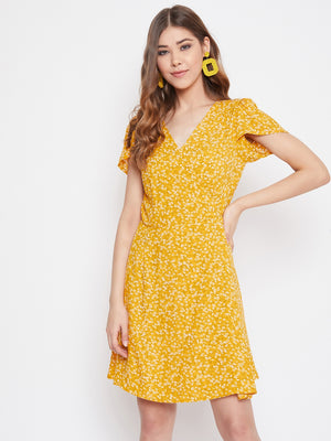 Berrylush Women Yellow Floral Printed A-Line Wrap Mini Dress