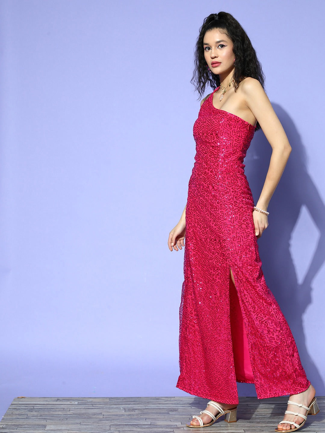 Berrylush Women Pink Embellished Pattern One-Shoulder Neck Georgette Thigh-High Slit Fit & Flare Maxi Dress