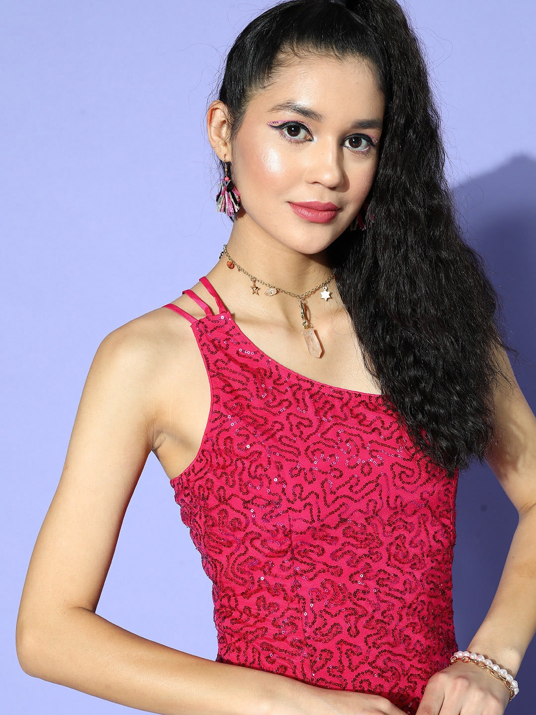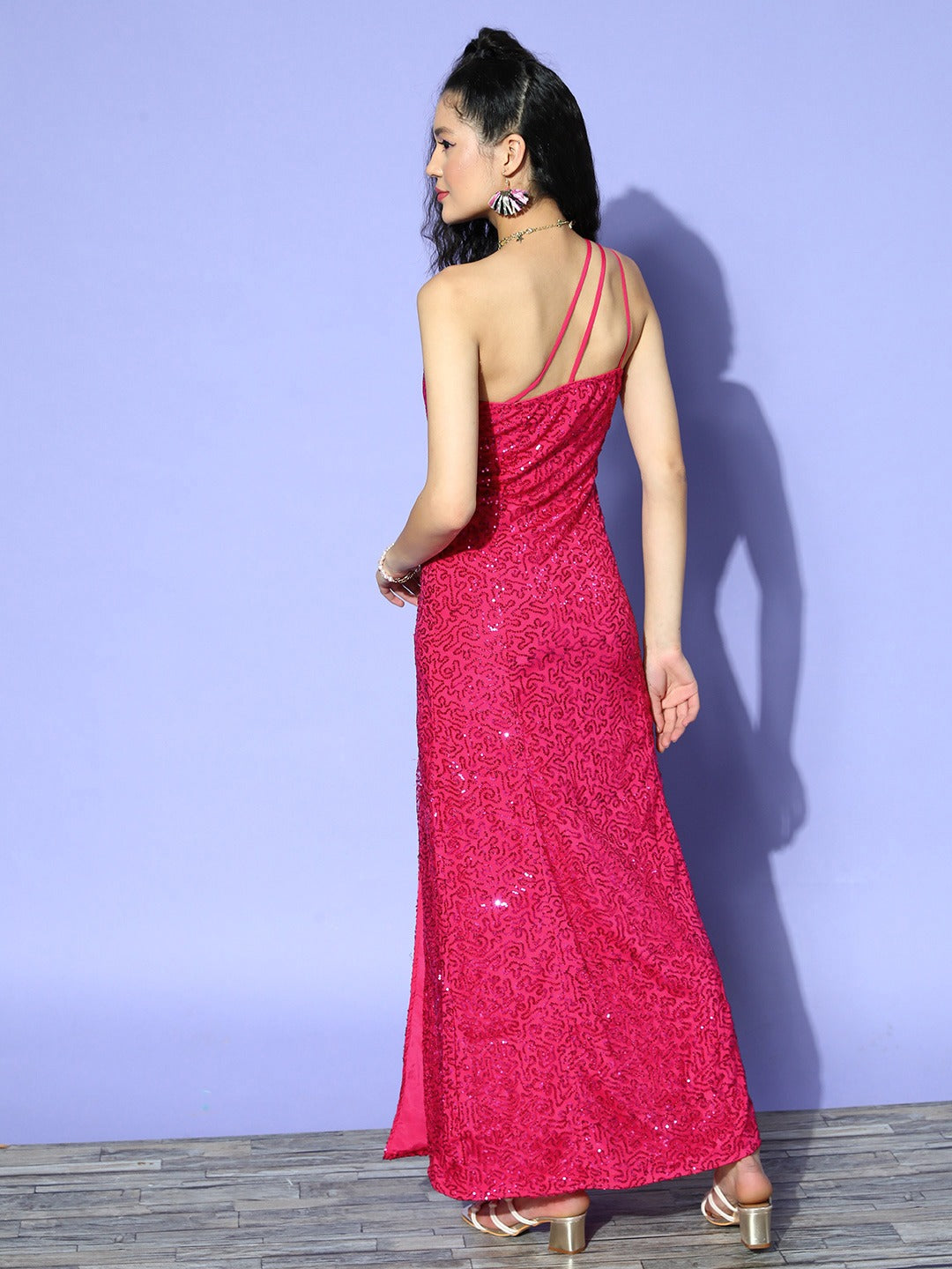 Amplify your party closet with empowering and feminine ensembles just like this pretty Embellished Pink One Shoulder Flared Maxi Dress designed by Berrylush. Adorned with an enchanting combination of fuchsia pink shade and embellished pattern that gives this dress cinematic sequin design and classy appeal. Highlighting a one-shoulder neck design that lends your neckline an enticing and asymmetric outline. The sleeveless design of this dress offers your beautiful arms an alluring disclosure for effortless movements. Wear this maxi dress with a pair of matching block heels, diamond hoop earrings, and your favourite clutch to get a stunning look for your birthday party.