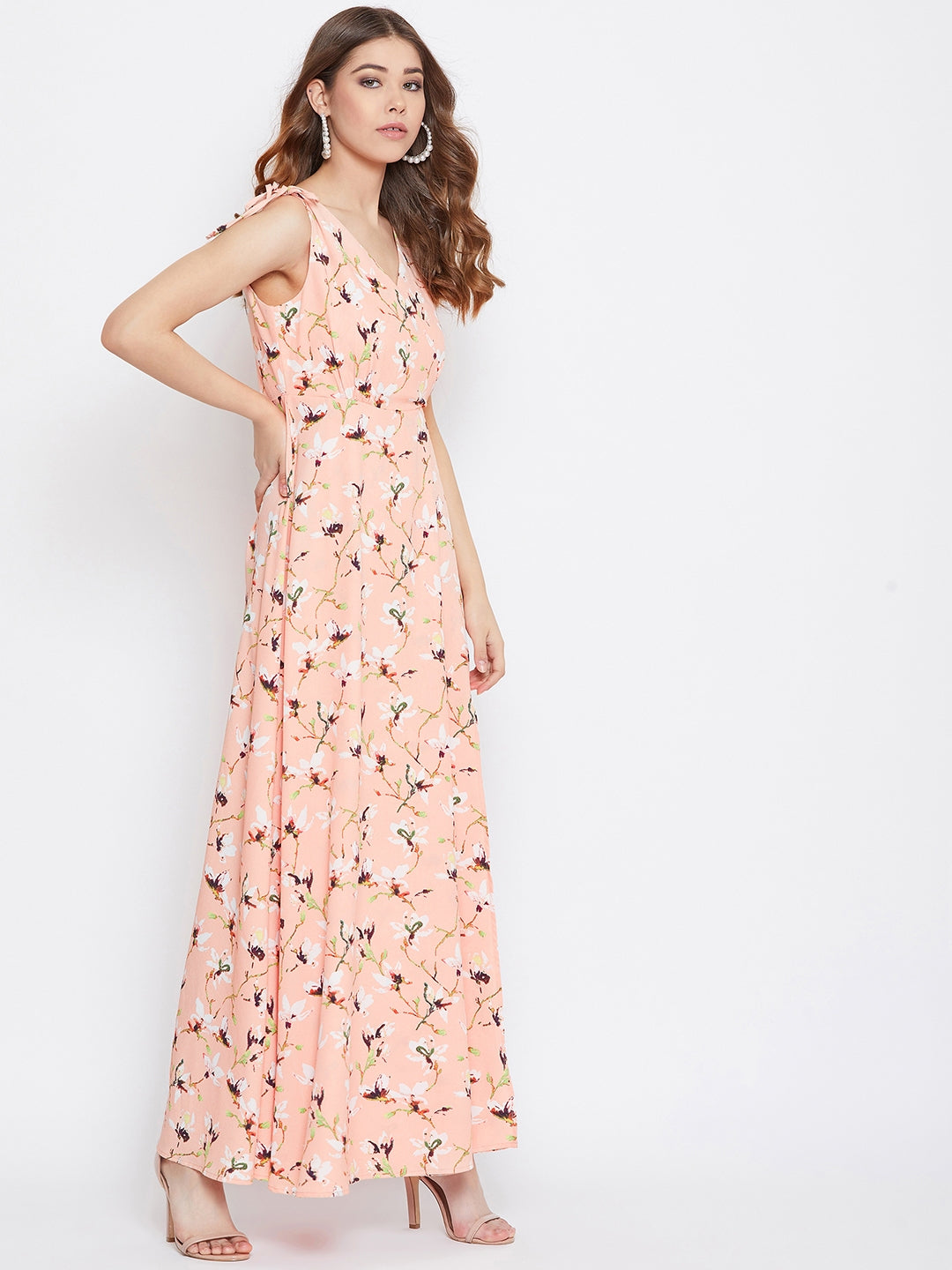 Looking for a trendy and stylish outfit for the upcoming casual events, then this Pink Floral Printed Tie-Knot A-Line Maxi Dress from Berrylush is the most suitable option for you. The beautiful combination of pink and navy blue tones brings out a playful and glamourous outlook. V-neck design and tie-knot straps outstand your collarbone area of the body while the flared hemline heightens the fashion-forward statement for casual party events. The all-over floral print complemented with polyester fabric makes the outfit elegant and comfortable. Match this stunning maxi dress with pink high heels and earring hoops for a cute appearance.