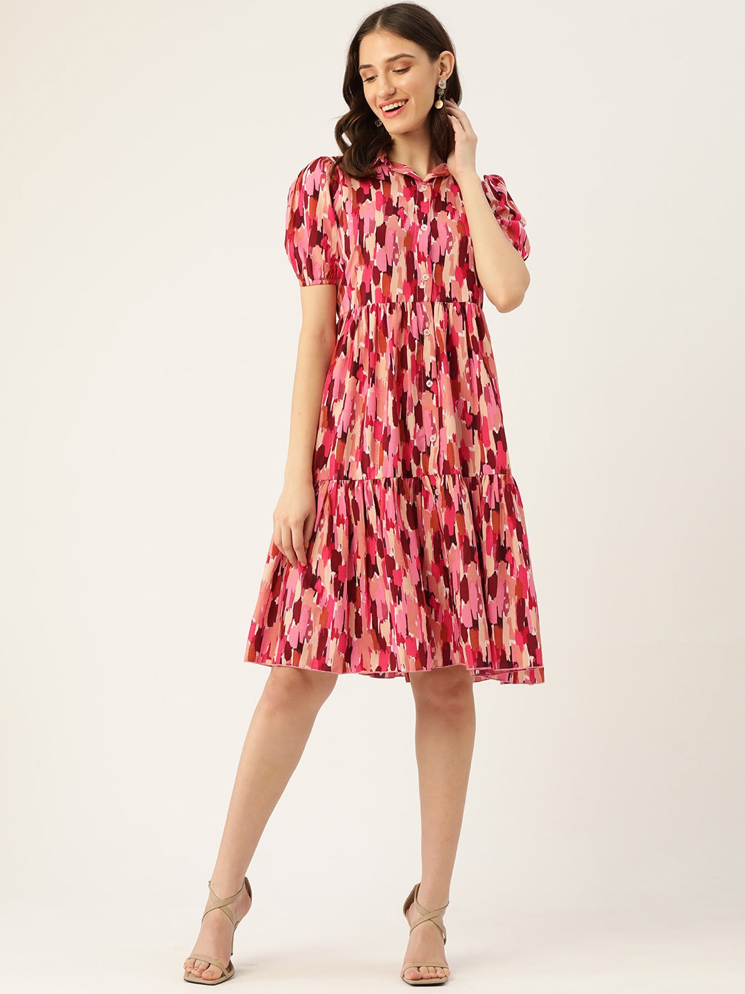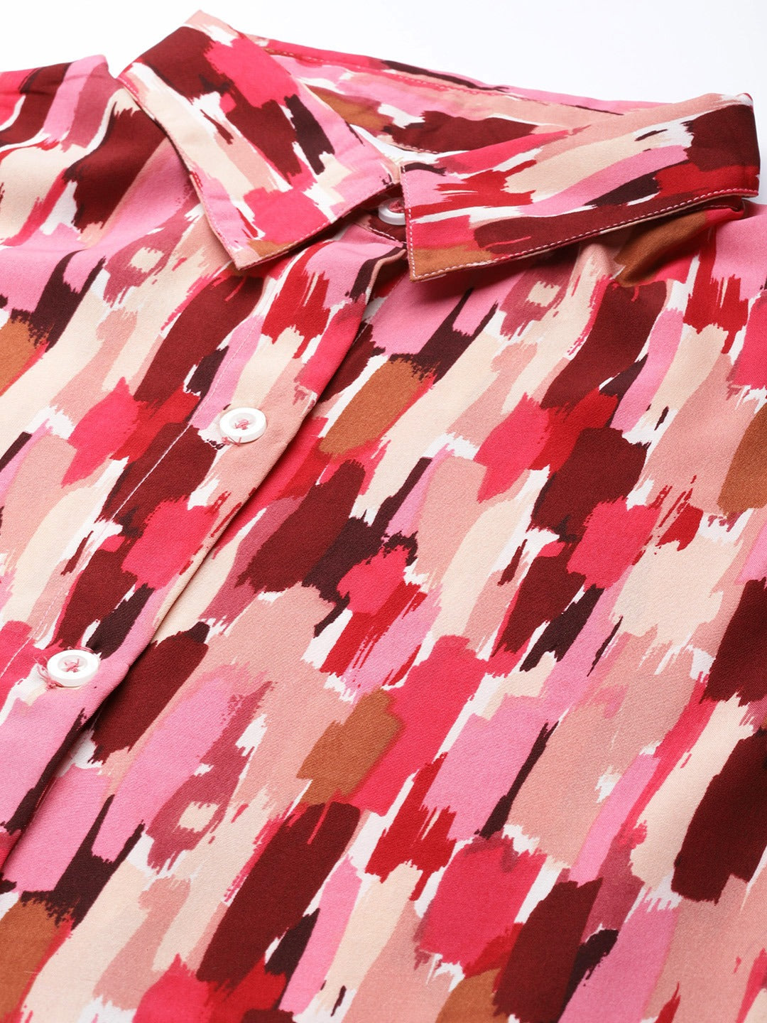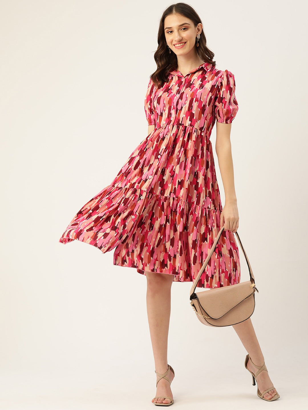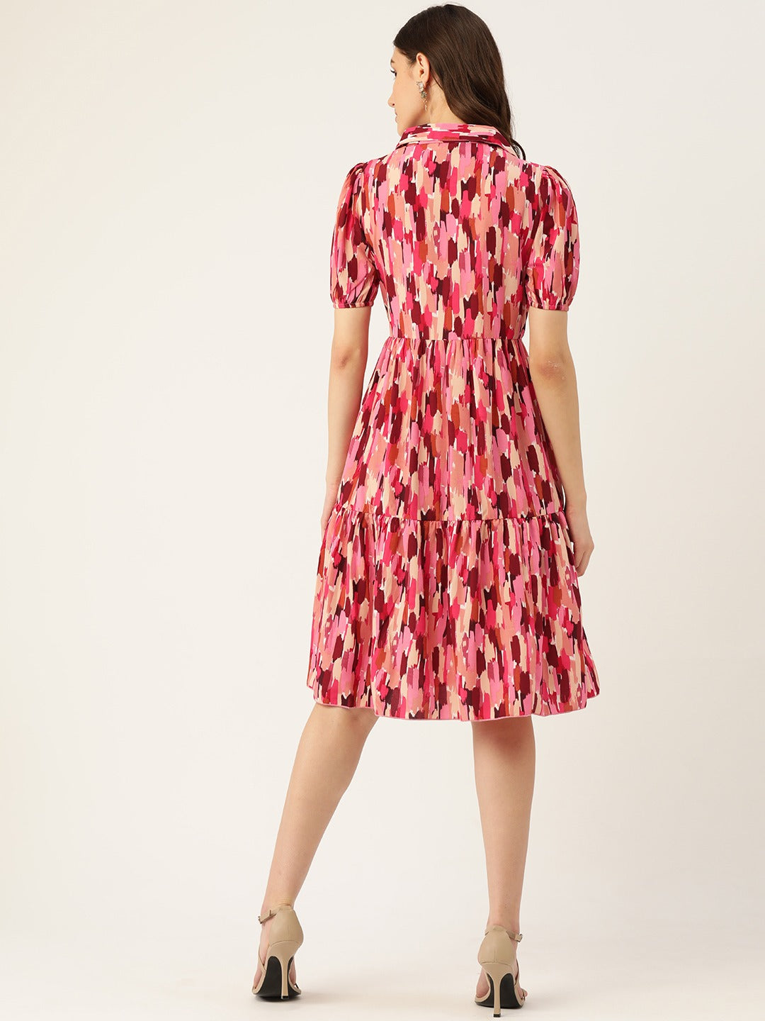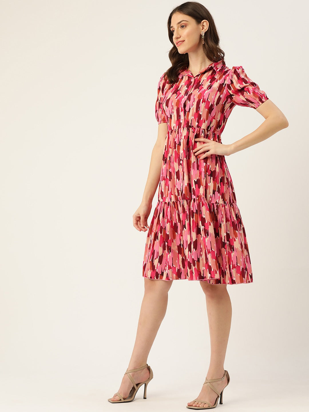 Berrylush Women Pink & Red Abstract Printed Shirt Collar Neck Flounce Hem Pleated A-Line Midi Dress