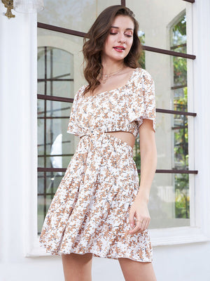 Berrylush Women White & Brown Floral Printed Square Neck Flutter Sleeves Cutout Crepe Fit & Flare Mini Dress