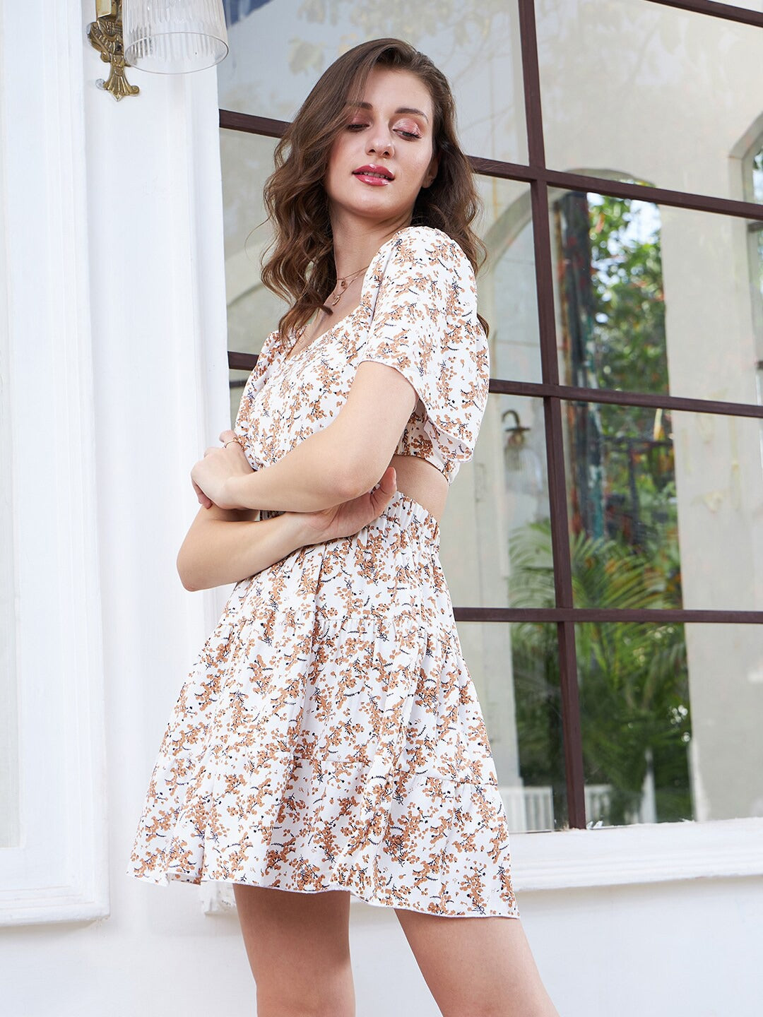 Stay up-to-date with fashion by reinventing your wardrobe with trendy and passionate essence like this stunning White & Brown Floral Printed Square Neck Flutter Sleeves Cutout Crepe Fit & Flare Mini Dress from Berrylush. Beautifully designed square neckline adds mesmerizing definition to your shoulders and neck. The magnetizing white tone reflects your intimate personality while the striking brown floral print assembles the charming texture of both modern and retro styles. Mini length gives elegant disclosure to your legs with an exotic vibe and the flared hemline gets you a super-chic and captivating look. You can pair up this fit and flare mini dress with a pair of high-heels and a sling bag to create a fabulous look.