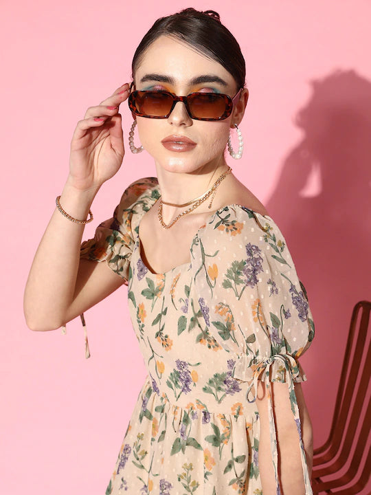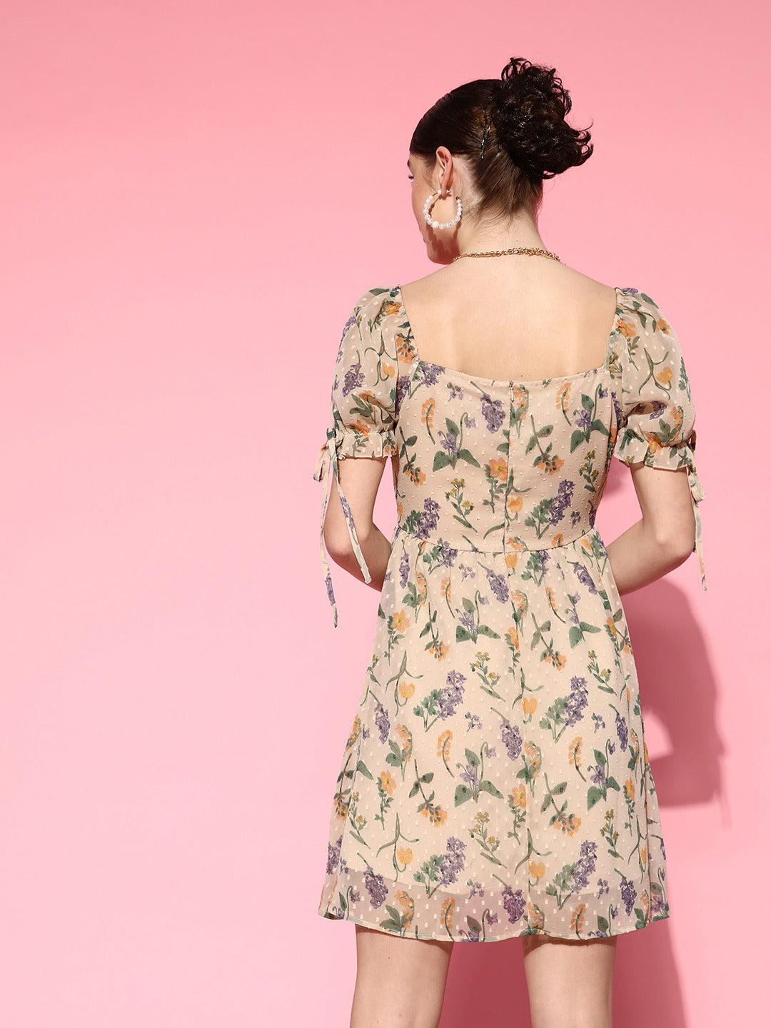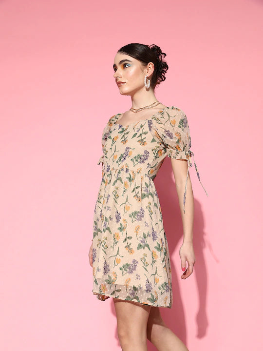 Berrylush Women Beige & Multicoloured Floral Printed Sweetheart Neck Tie-Up Georgette Fit & Flare Mini Dress
