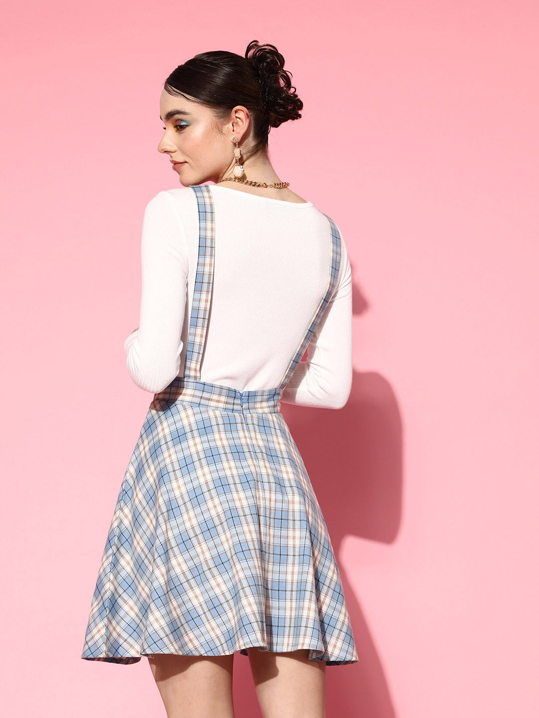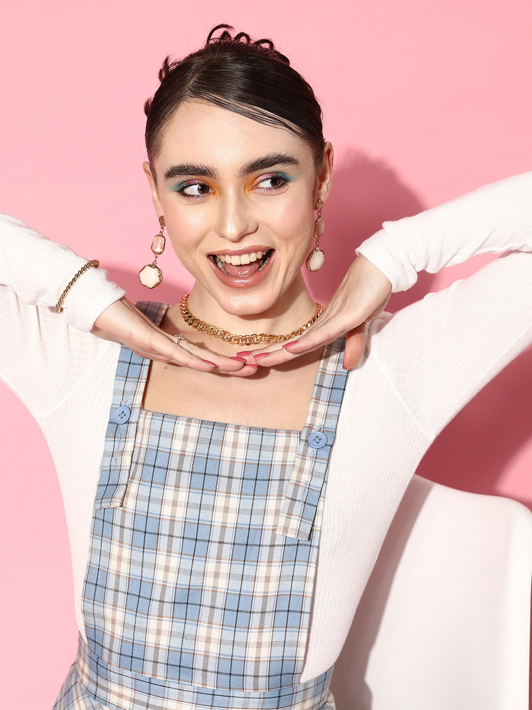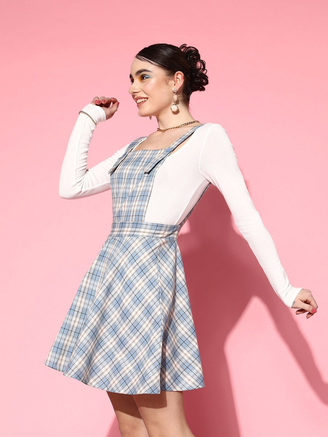 Searching for minimal yet elegant signature pieces for a capsule closet, then you can stop right here as the most appropriate option for you is this majestic Checked Blue and White Flared Pinafore Mini Dress launched by Berrylush. Flaunting pinafore style that lends this dress classic Victoria era style with a modern twist. Showing off pleated surface styling that adjoins cinematic pleats and flair to this dress for a voluminous appearance. Detailed with a button closure that lends this dress ease wearing feature with a cute ornamental sheen. Go on a picnic date on the weekend while looking gorgeous by pairing this mini dress with a white top, white sneakers, beads hoop earrings, and a cute tote bag.