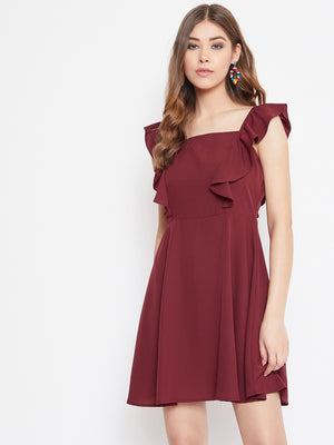 Berrylush Women Solid Maroon Sleeveless Ruffled Fit & Flare Mini Dress