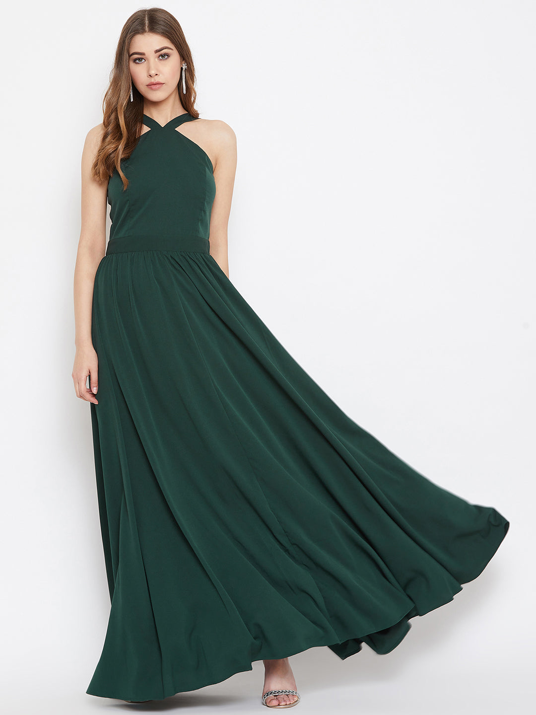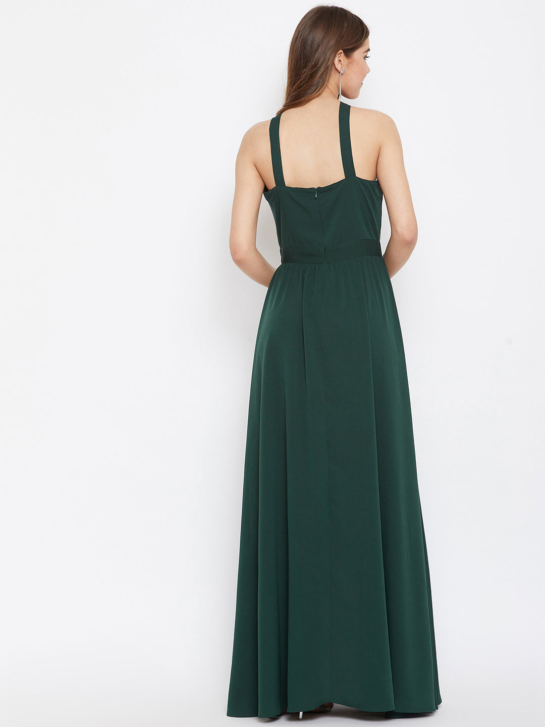 Berrylush Women Solid Green Halter Neck Flared Maxi Dress