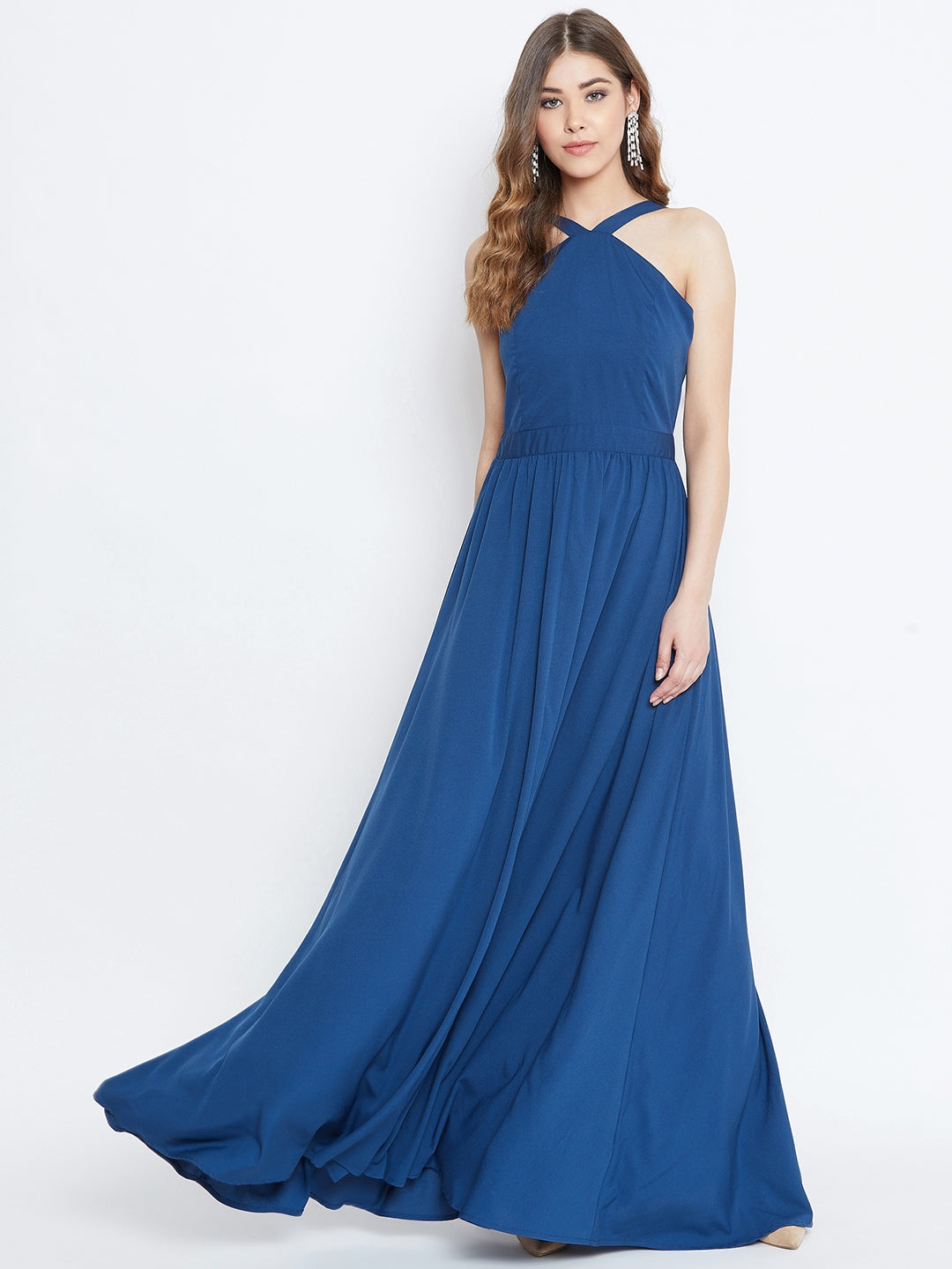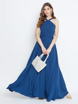 Berrylush Women Solid Blue Halter Neck Flared Maxi Dress