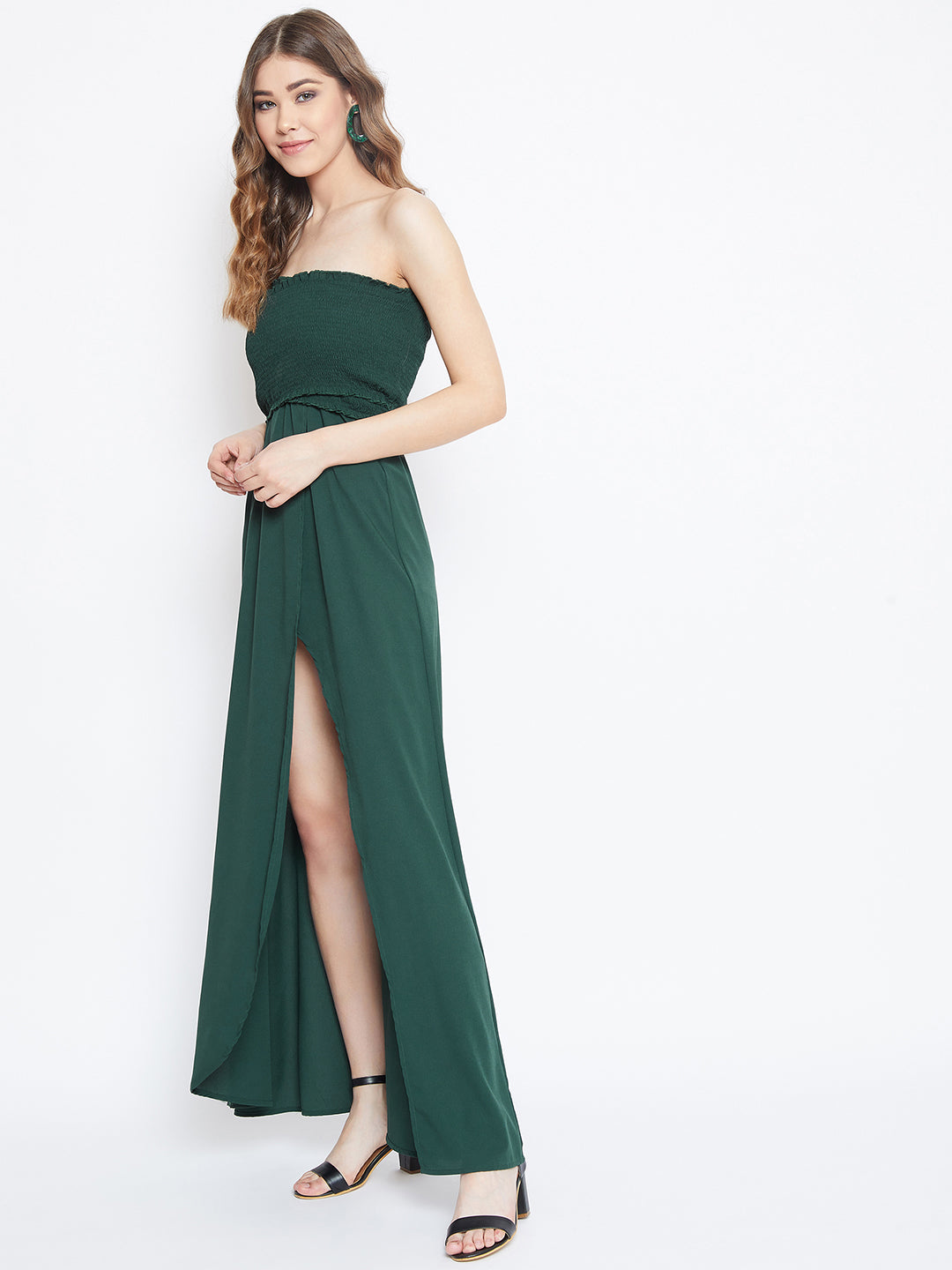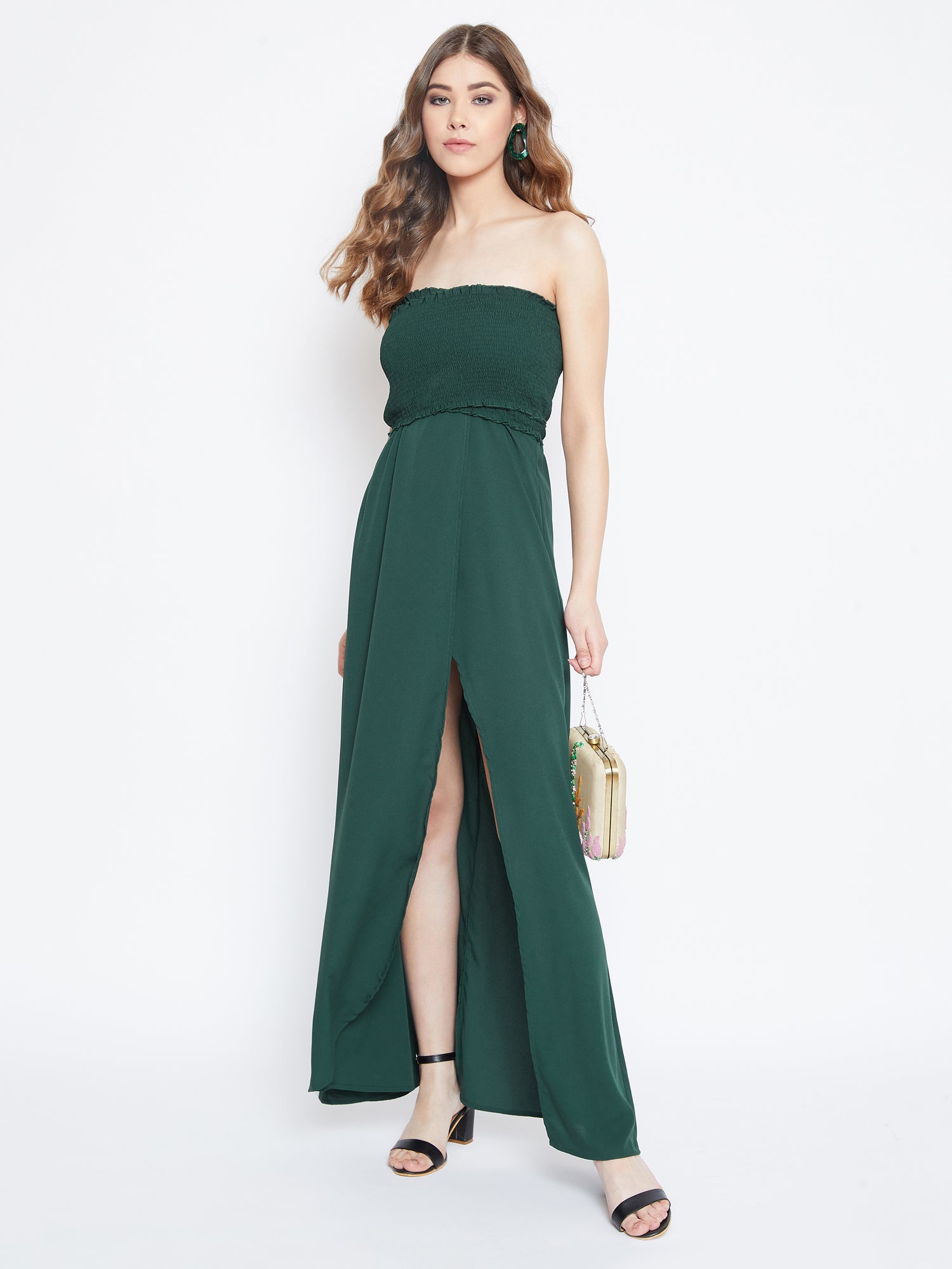 Spread the captivating beauty of your persona with this Solid Green Front Slit Smocked Maxi Dress from Berrylush. This lush green maxi dress comes with a charming smocked front which in itself is a flamboyant styling element. The off the shoulder neckline gives the ultra modern look to both your neck and back. This maxi dress looks exquisite with the front thigh high slit detailing that undoubtedly stylizes your steps. This fascinating youthful green colour of this maxi dress going to set your voguish stature into that of a supermodel. Style this amazing dress with high-heeled pumps and a sling bag to complete your fashionable look. Show the world the ultimate way of having a party style from Berrylush.