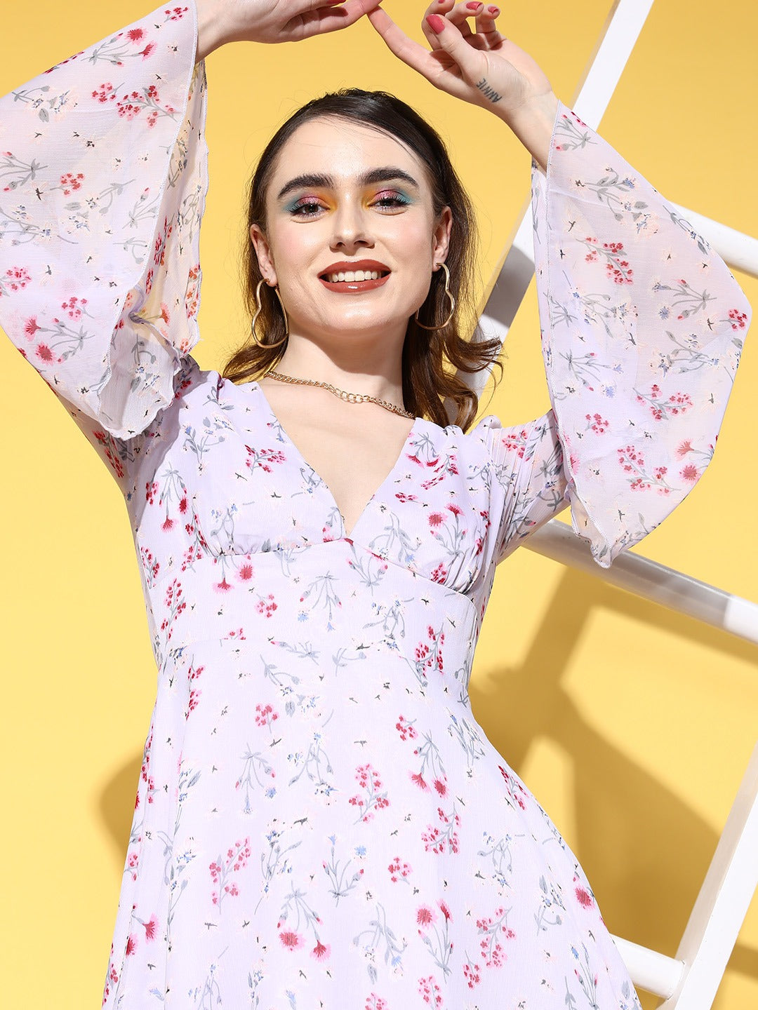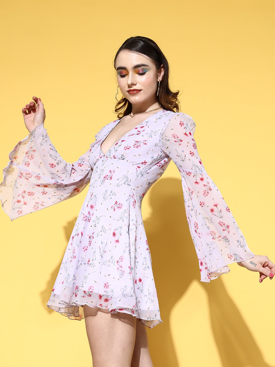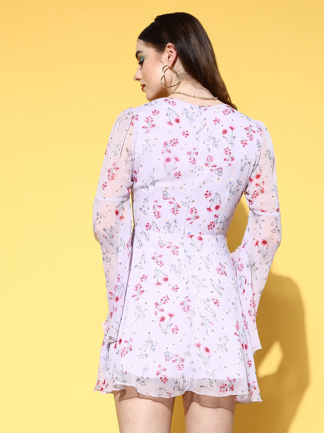 Berrylush Women Purple & Pink Floral Printed V-Neck Bell Sleeves Chiffon Semi-Sheer Fit & Flare Mini Dress
