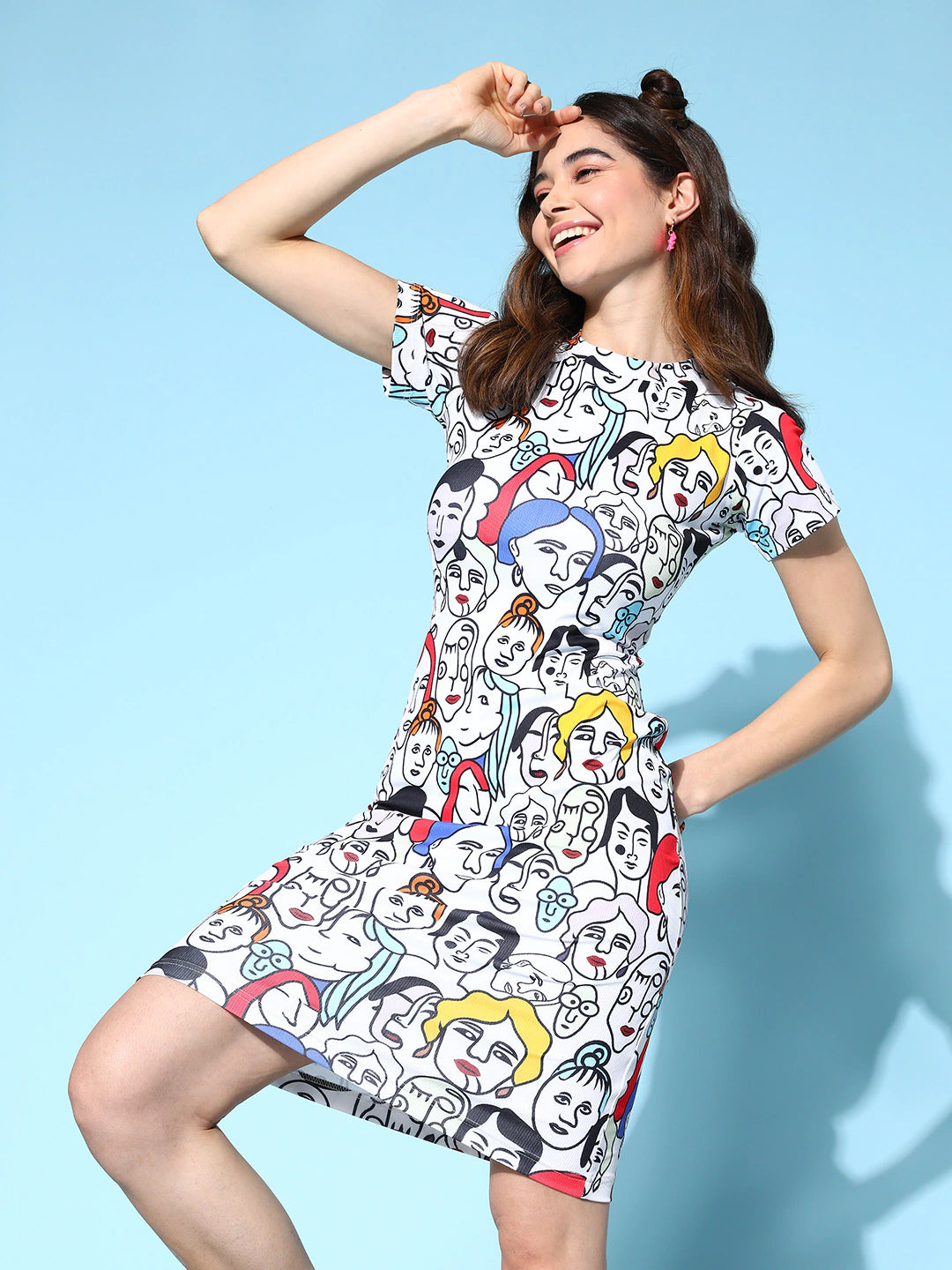 Berrylush Women White & Black Graphic Printed Round Neck Polyester Straight Hem Knitted Bodycon Mini Dress