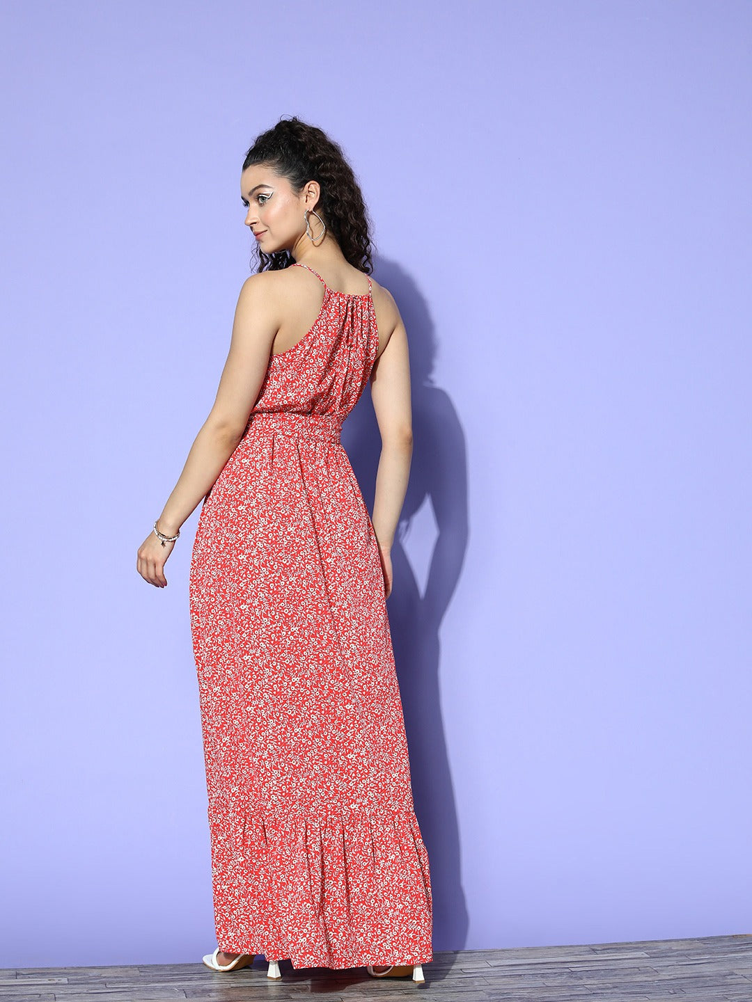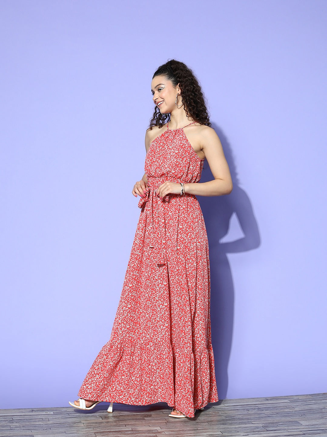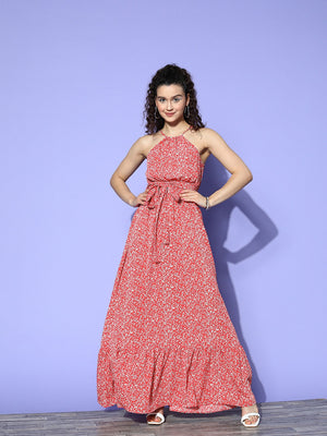 Berrylush Women Red & White Floral Printed Halter Neck Waist Tie-Up Crepe Flounce Hem Maxi Dress
