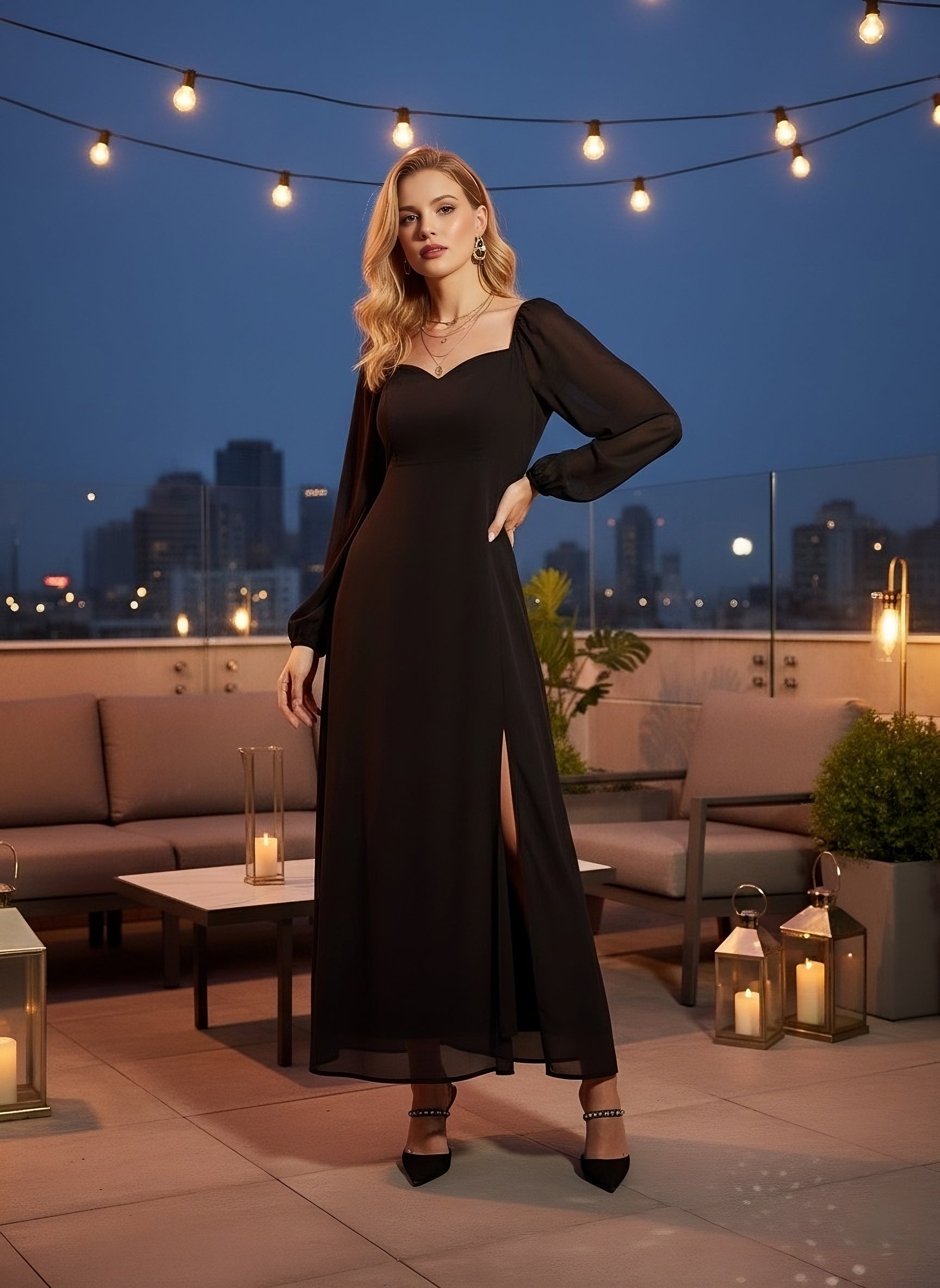 Introduce elegance to your evening wear with the stunning Solid Black Sweetheart Neck Bishop Sleeves Thigh-High Slit Straight Hem A-Line Maxi Dress from Berrylush. Crafted from high-quality woven polyester, this exquisite maxi dress seamlessly blends comfort and style, making it perfect for any party or formal event. The flattering sweetheart neckline beautifully frames your décolletage while the dramatic bishop sleeves add a touch of sophistication. With its thigh-high slit, this dress ensures you’ll make a memorable entrance as it gracefully flows around you. Lined for opaque coverage and featuring a concealed zipper closure for effortless wear, you'll feel confident in both fit and flair all night long. The classic black hue allows versatile styling opportunities; accessorize boldly or keep it minimalistic - either way, heads will turn in delight!